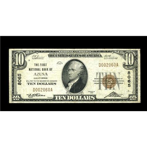 <B>Azusa, CA</B></I> - $10 1929 Ty. 1 <B>The First NB</B></I> Ch. # 8065<BR>While not rare, notes from this Los Angeles County bank are avidly sought after and not often available. Pleasing <B>Fine+++.</B></I>