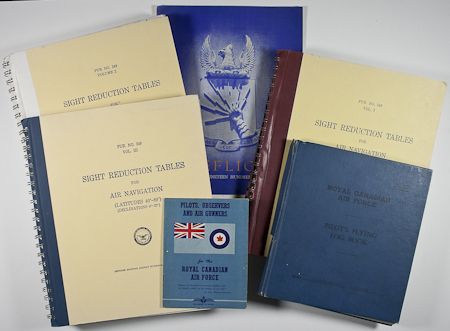 Large grouping of ephemera from World War II B-17 pilot Capt. Charles F. Hanselman, includes: Royal Canadian Air Force Pilot's Log Book, showing his training in single-engine aircraft from Oct. 29 to Dec. 13, 1941, R.C.A.F. promotional booklet for potential pilots, ca. 1938; his Pilot Log Book, about 75pp. 8vo., with entries from Aug. 10, 1942 to Feb. 14, 1943, day and night training, accompanied and solo; U.S.A.A.F. cadets handbook, about 20pp. 4to. Maxwell Field, Al, Aug., 1942; Army Air Force Dead Reckoning Computer Type E-6B with case and instructions, made by Cruver, Chicago; a second Dead Reckoning Navigation Computer, Type MB-4, mil spc. MIL-C-5414-b, made by G. Felsenthal & Sons; a "memory map" of France, 8vo.,; Weems & Plath Star Finder model 2102-D with case, and three vols. ca. 1977 sight reduction tables.