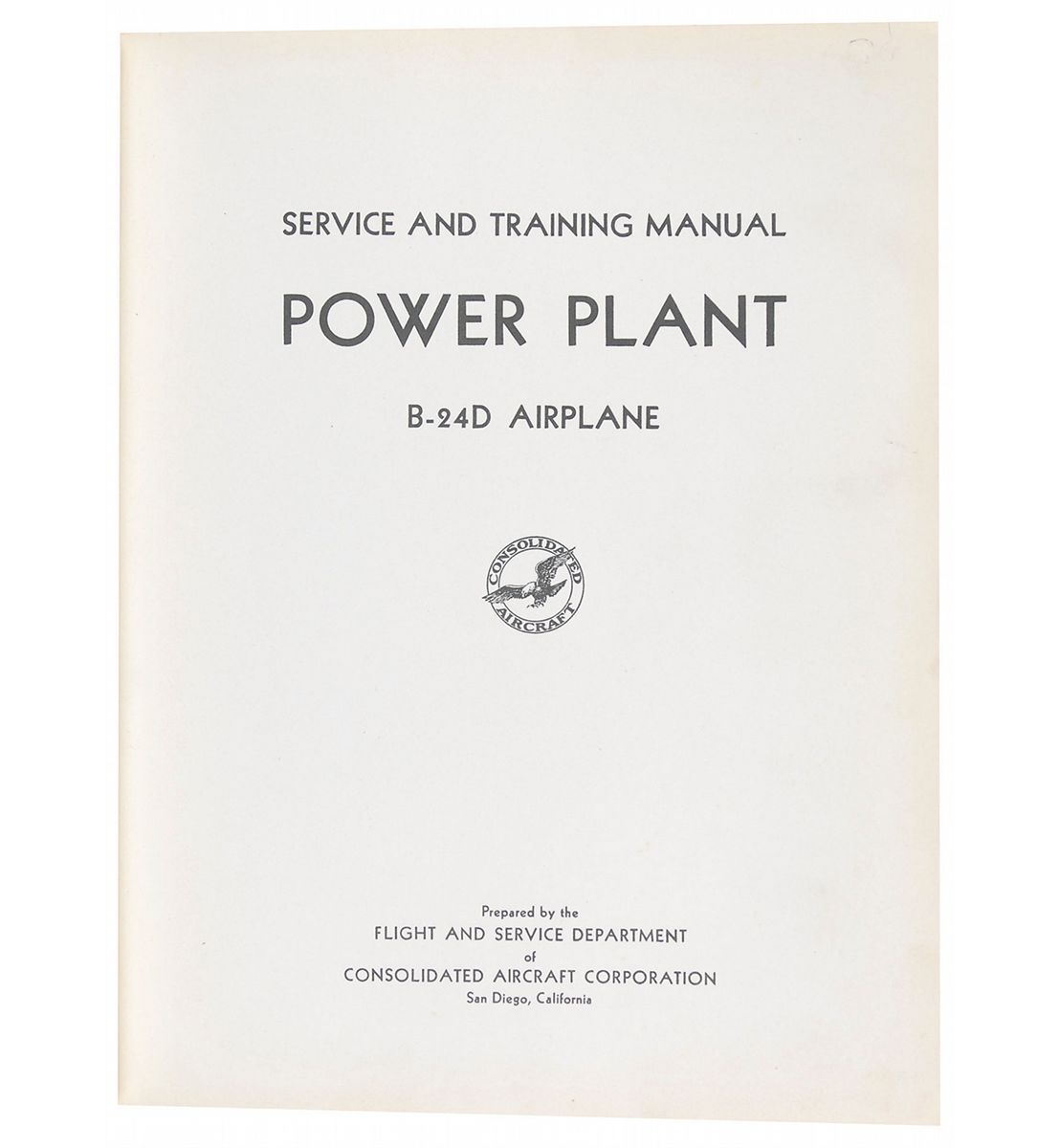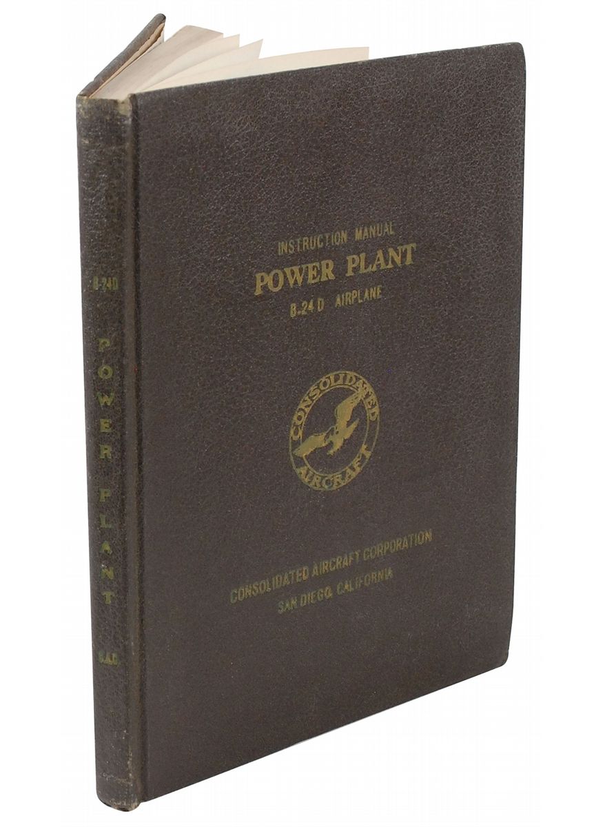 Hardcover instruction manual entitled “Power Plant B-24 D Airplane,” 9 x 11.25, 203 pages, printed in 1943 by Consolidated Aircraft Corporation. Manual consists of 21 chapters and features 145 illustrations. In fine condition, with some mild wear to covers, toning to pastedowns, and previous owner’s signature on first page.