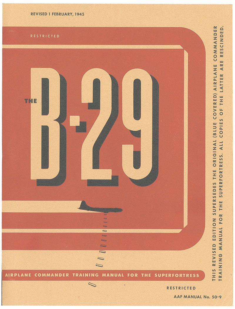Restricted training manual entitled “The B-29, Airplane Commander Training Manual for the Superfortress,” 8 x 10.5, 177 pages, bound by three holes punched to left edge. Second page bears a foreword from General H. H. Arnold, with a printed signature at the conclusion, and states: “The techniques and procedures described in this book are standard and mandatory. In this respect the manual serves the dual purpose of a training checklist and a working handbook.” In fine condition, with some light creasing to front cover.