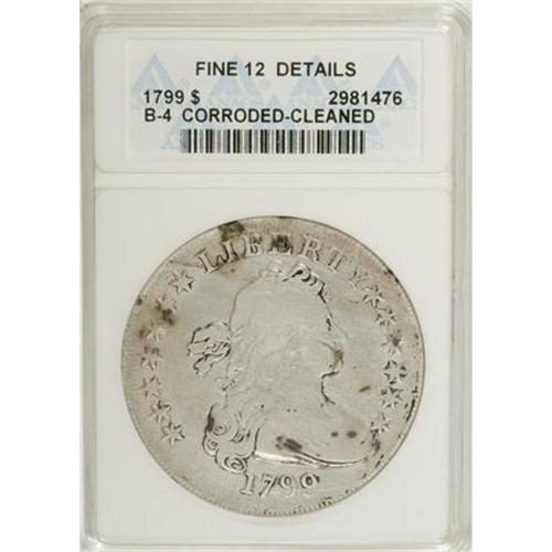 <B>1799 $1 Irregular Date, 15 Stars Reverse--Corroded, Cleaned--ANACS. Fine 12 Details.</B></I> B-4, BB-153, R.4. Bowers-Borckardt Die State II. A slate-gray silver dollar with several dashes of charcoal-gray, mostly near the borders. The upper obverse has two faintly granular streaks. Softly struck near the eagle's head, but there are no distracting marks. <BR><BR><b>Shipping:</b> Coins & Currency (<a target="_blank" href="http://www.heritageauctions.com/common/shipping.php">view shipping information</a>)