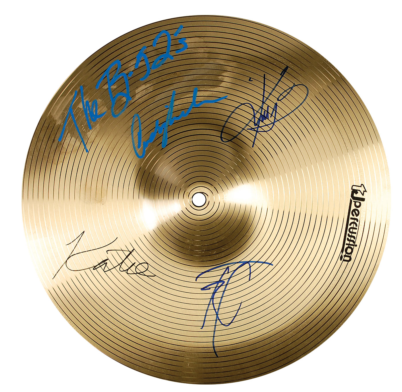 Unused 13.5” TJ Percussion drum cymbal, signed on the top in blue ink and felt tip by Fred Schneider, Kate Pierson, Cindy Wilson, who added “The B-52s,'” and Keith Strickland. In fine condition, with a patch of surface marks near Wilson’s signature.