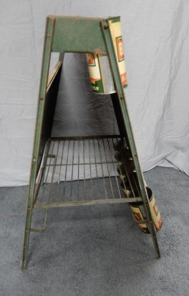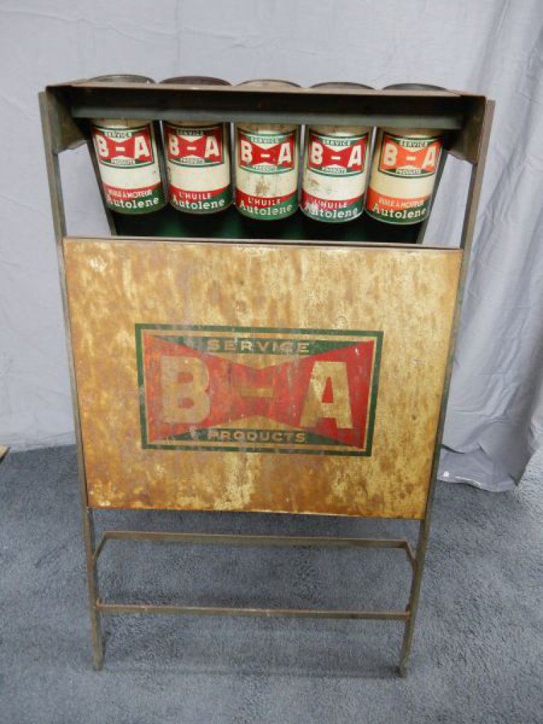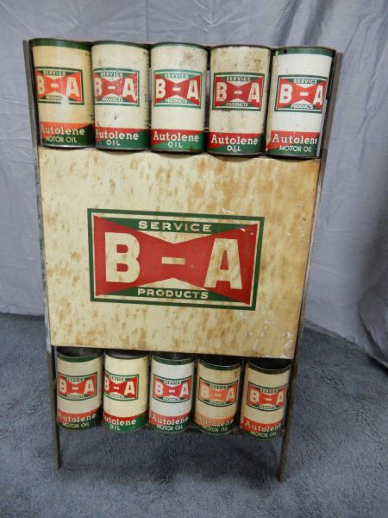 B-A BOWTIE OIL CAN RACK & 10 AUTOLENE IMP QT CANS RACK HOLDS 20 CANS - SURFACE RUST ON RACK & CANS LOCATION: LOWER BACKROOM