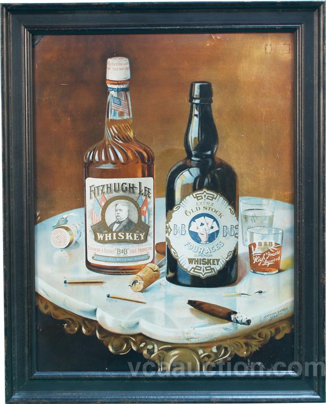 B&B High Grade Liquors Atlanta, GA. Tin Sign w/ 2 whiskey bottles on table. One of the whiskey bottles has picture of Fitzhugh Lee (relative of Robert E. Lee) & the other bottle shows "four aces" hand of cards. Signed Sentenne & Green New York, in wood frame - 16" x 20"