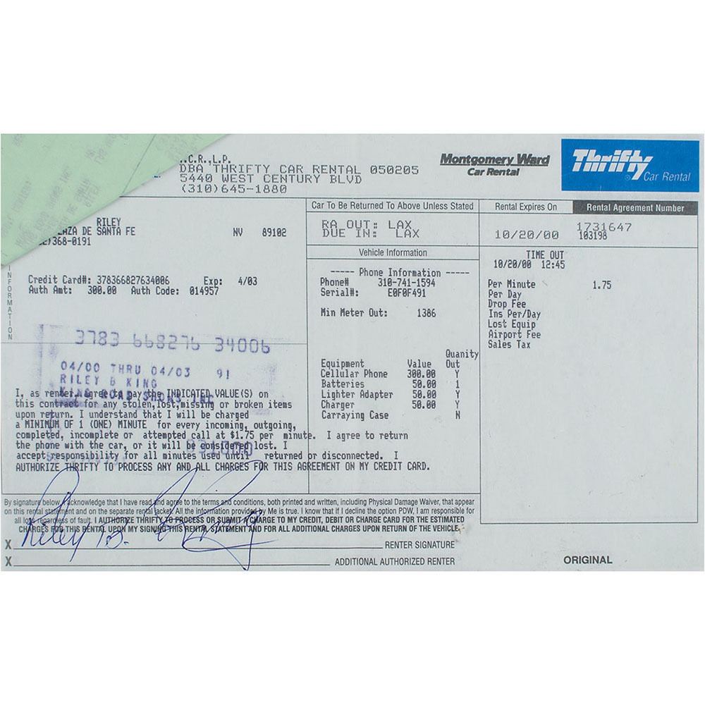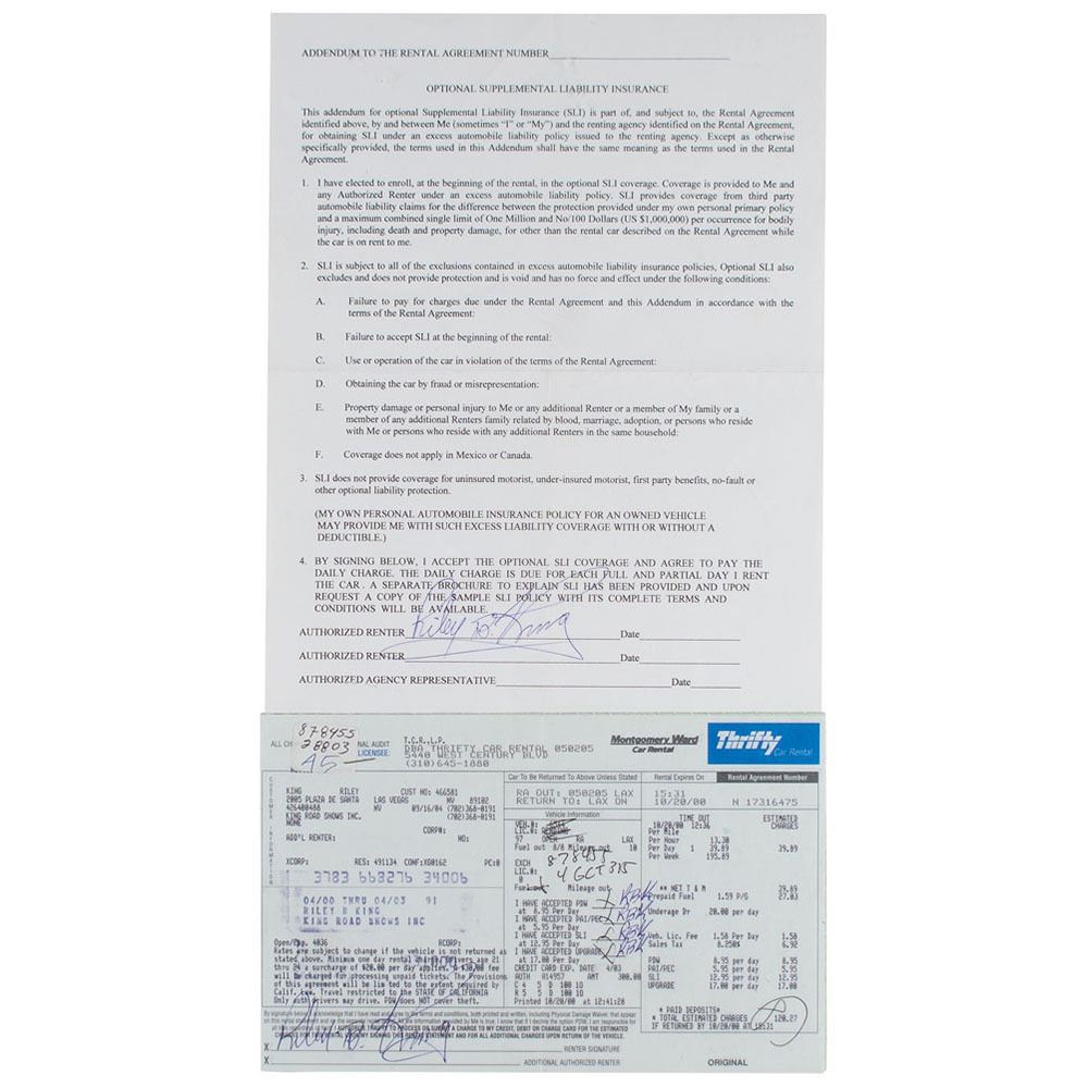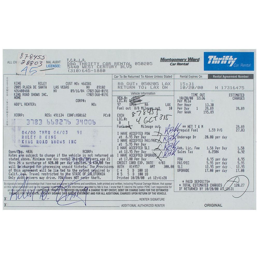 Two documents signed by B. B. King with his given name, “Riley B. King,†in relation to a Thrifty Car Rental purchase from Los Angeles International Airport on October 20, 2000. The first is a two-page agreement receipt, 8.75 x 5.5, for a one-day car rental from LAX, with King signing both pages of the agreement in blue ballpoint and adding his initials, "RBK," a total of four times to the first page. The second document is a one-page addendum to the rental agreement, 8.5 x 11, which is signed at the bottom in blue ballpoint. In overall fine condition.