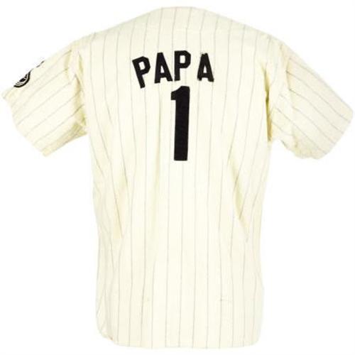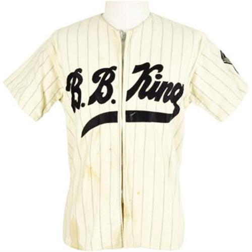 <B>B.B. King Baseball Tour Jersey.</B></I> A baseball-style tour jersey, white with light blue pinstripes, with "B.B. King" on the front and "Papa 1" on the back, from an unspecified tour. In Fine to Very Fine condition with some mild discoloration and mild to moderate soiling on the front.<BR><BR><b>Shipping:</b> Clothing, Costumes & Jerseys (<a target="_blank" href="http://www.heritageauctions.com/common/shipping.php">view shipping information</a>)