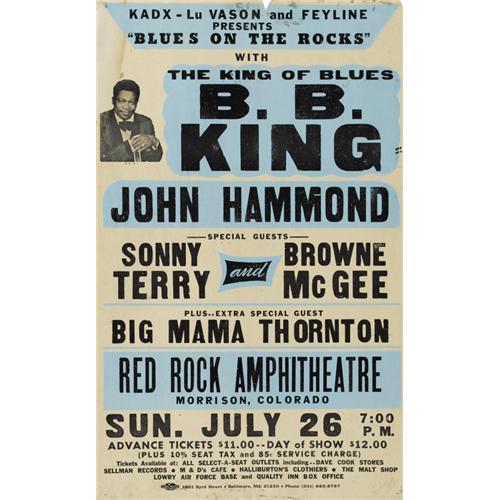<B>B. B. King "Blues on the Rocks" Red Rocks Concert Poster (circa 1975)</B></I> They call him the "King of the Blues", and here's a truly majestic concert poster for his many fans and followers! This mammoth, 22" x 35" poster was used to promote a night of "Blues on the Rocks", and the famous Red Rocks Amphitheatre in Morrison, Colorado. Joining King was John Hammond, Sonny Terry and Brownie McGee, and Big Mama Thornton. This blue and black silkscreened poster is in VG condition.