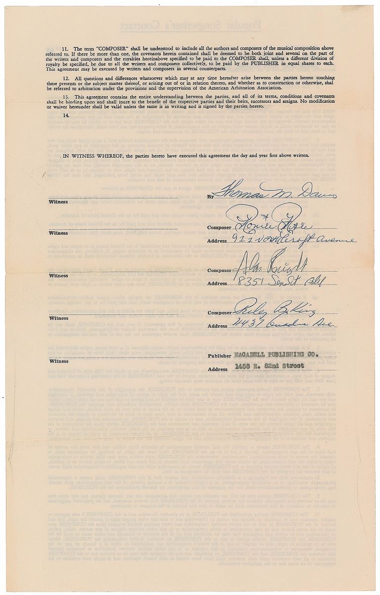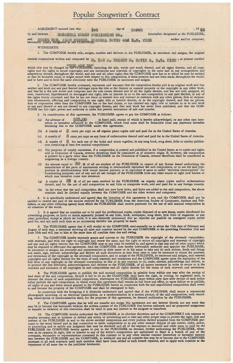 DS, signed “Riley B. King,” one page both sides, 8.5 x 13.5, March 1, 1962. Popular songwriter’s contract between Macadell Publishing Co., and Ronie Rae, Alan Knight, Maxwell Davis, and B. B. King, in which the latter party transfers the rights to “the original musical composition…at present entitled ‘You Ask Me.’” Signed at the conclusion in black ballpoint by King. In fine condition.