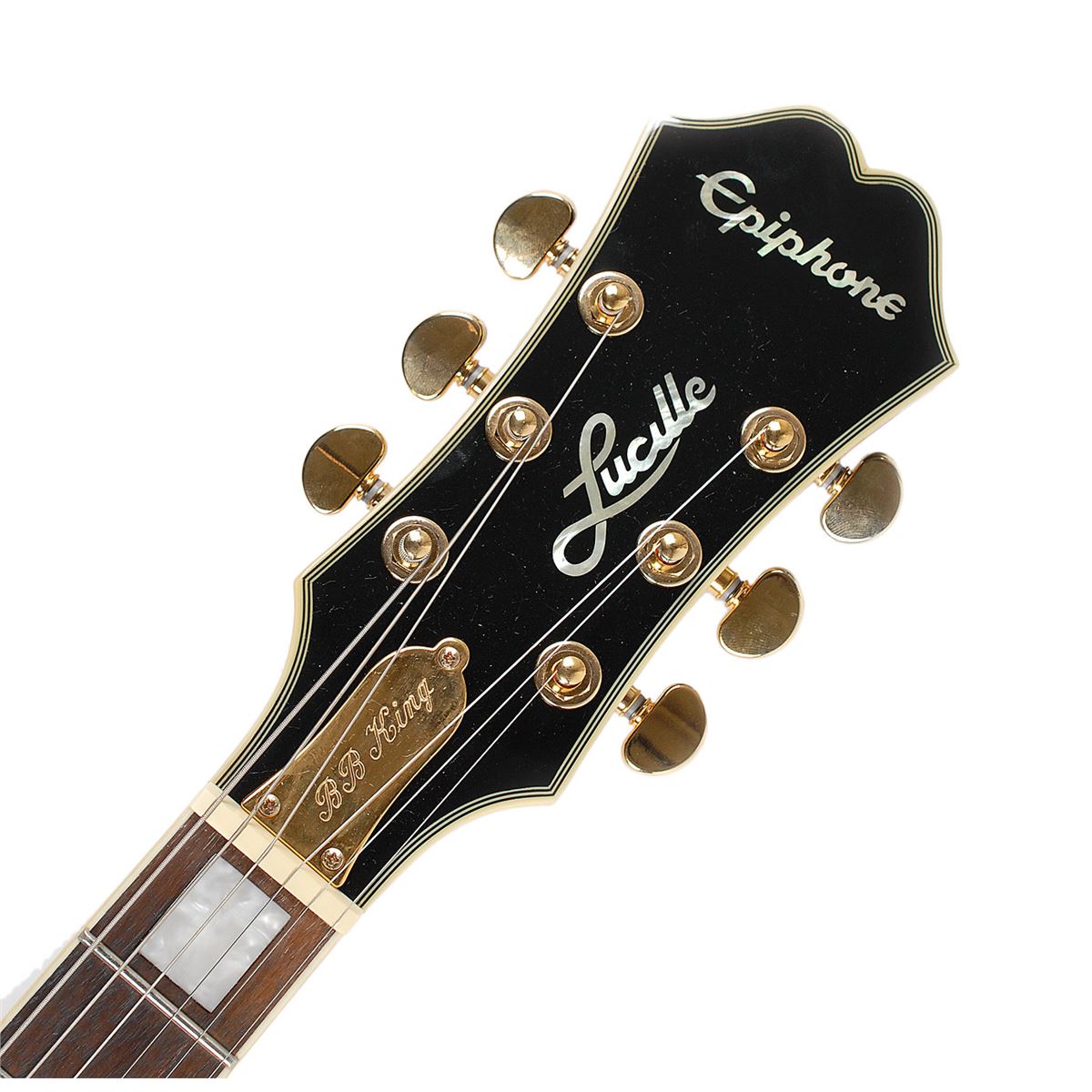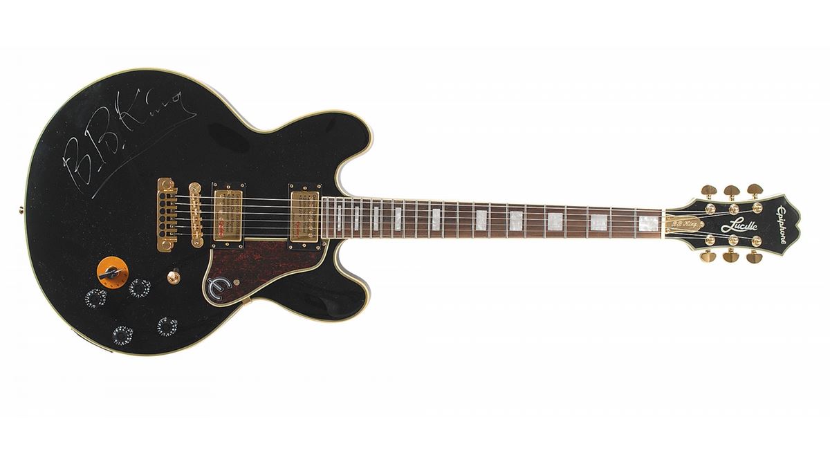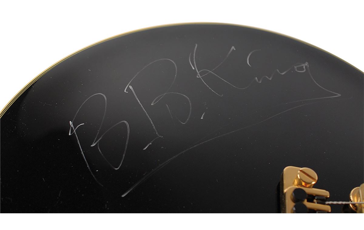 Gorgeous ebony-bodied Epiphone B. B. King Lucille electric guitar, signed on the body in silver ink. Includes an Epiphone hardshell case. In fine condition. Accompanied by a full letter of authenticity from JSA. Oversized.