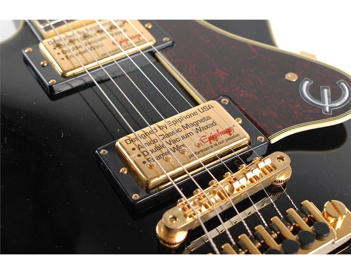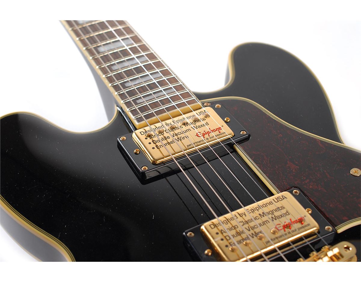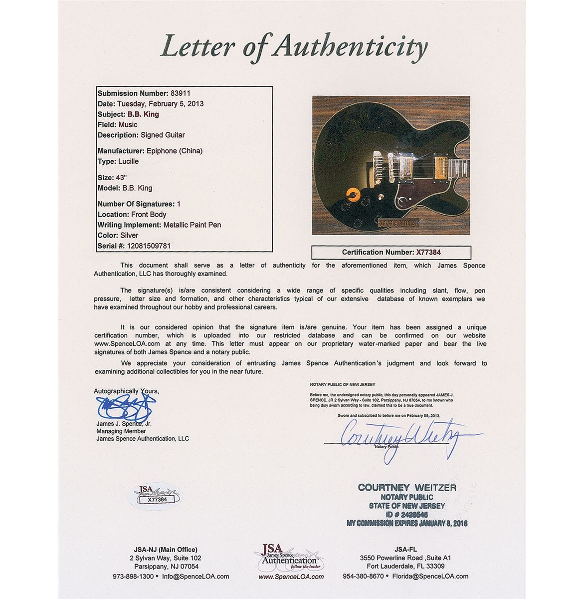 Gorgeous ebony-bodied Epiphone B. B. King Lucille electric guitar, signed on the body in silver ink. Includes an Epiphone hardshell case. In fine condition. Accompanied by a full letter of authenticity from JSA. Oversized.