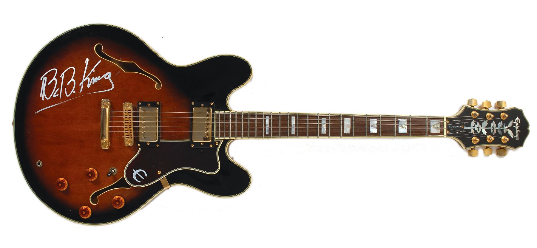 Beautiful right-handed antique sunburst semi-hollowbody Epiphone Sheraton II electric guitar, serial No. S5096284, signed on the body in silver ink by King. In fine condition. Accompanied by a full letter of authenticity from REAL. Similar to the John Lee Hooker 50th anniversary Sheraton, this is a flat-out gorgeous instrument designed for the blues and signed by one of the genre’s very best to ever play.