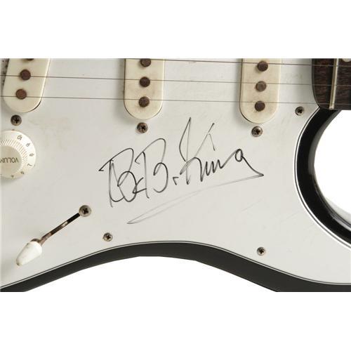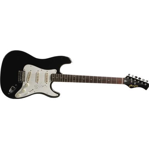 <B>B. B. King Signed Guitar.</B></I> A black Memphis six-string electric guitar signed by the Blues legend in black marker on the pick guard. In Very Fine to Excellent condition with some mild soiling and wear.<I>Accompanied by LOA from PSA/DNA.</B></I><BR><BR><b>Shipping:</b> Other (oversized items, group lo (<a target="_blank" href="http://www.heritageauctions.com/common/shipping.php">view shipping information</a>) <BR><BR><B>Important no