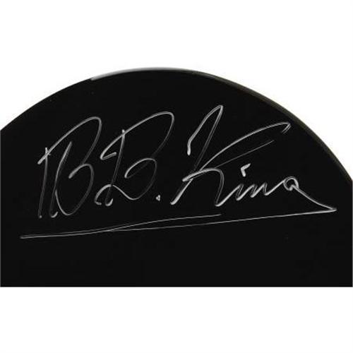 <B>B.B. King Signed Guitar.</B></I> A black six-string Epiphone Junior electric guitar signed on the body by the legendary Bluesman in silver felt tip in August of 2007 at the Renaissance Hotel in Northbrook, IL. In Excellent condition, accompanied by a wall-mountable metal carrying case with a plexiglass viewing window on one side. <I>Accompanied by a COA from PSA/DNA.</B></I><BR><BR><b>Shipping:</b> Musical Instruments, Large (<a target="_blank" href="http://www.heritageauctions.com/common/shipping.php">view shipping information</a>)