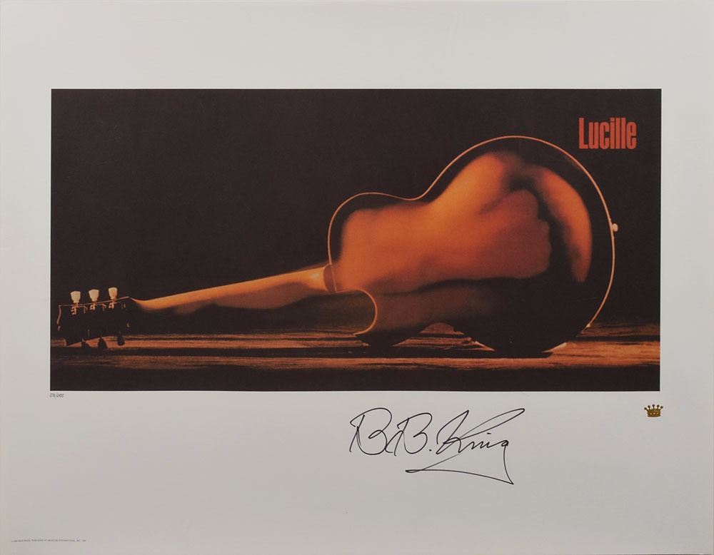 Color limited edition 28 x 22 lithograph of his famous guitar 'Lucille,' numbered 58/685, prominently signed in the lower border in black felt tip, "B. B. King." Rolled and in fine condition.