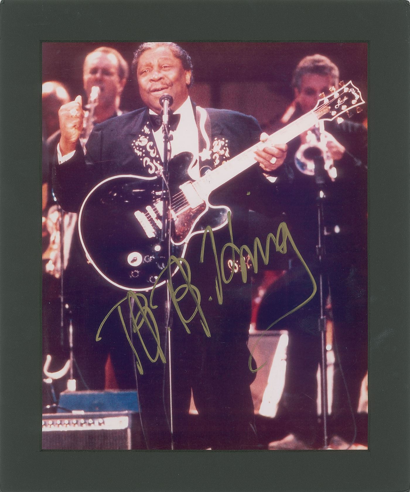 Color glossy 7.75 x 9.75 three-quarter-length photo of King holding his Lucille guitar on stage, signed in gold ink. Matted to a slightly larger size. In fine condition.