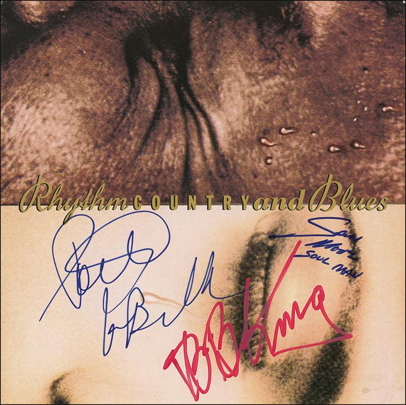 Rhythm Country and Blues album flat signed on the front in red felt tip by B. B. King and in blue felt tip by Patti LaBelle and Sam Moore, adding “Soul Man.” In fine condition.