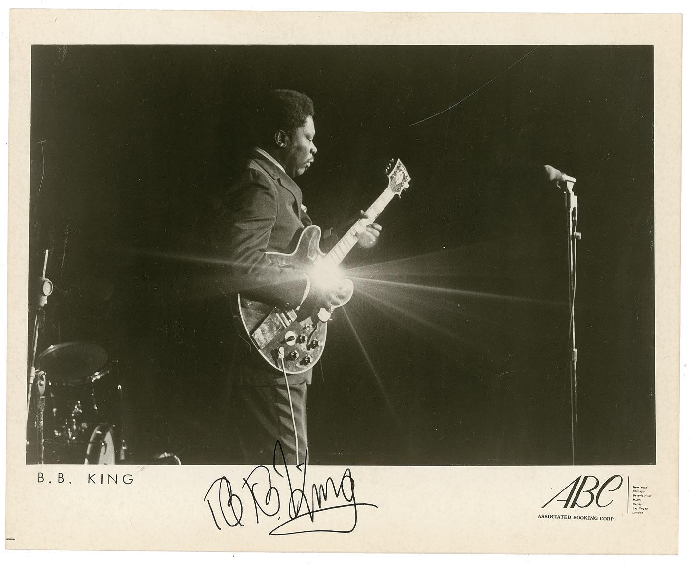 Glossy 10 x 8 Associated Booking Corp. publicity photo of King and Lucille in concert, signed in black felt tip. In fine condition, with slight discoloration along the edges and light spotting to the finish.