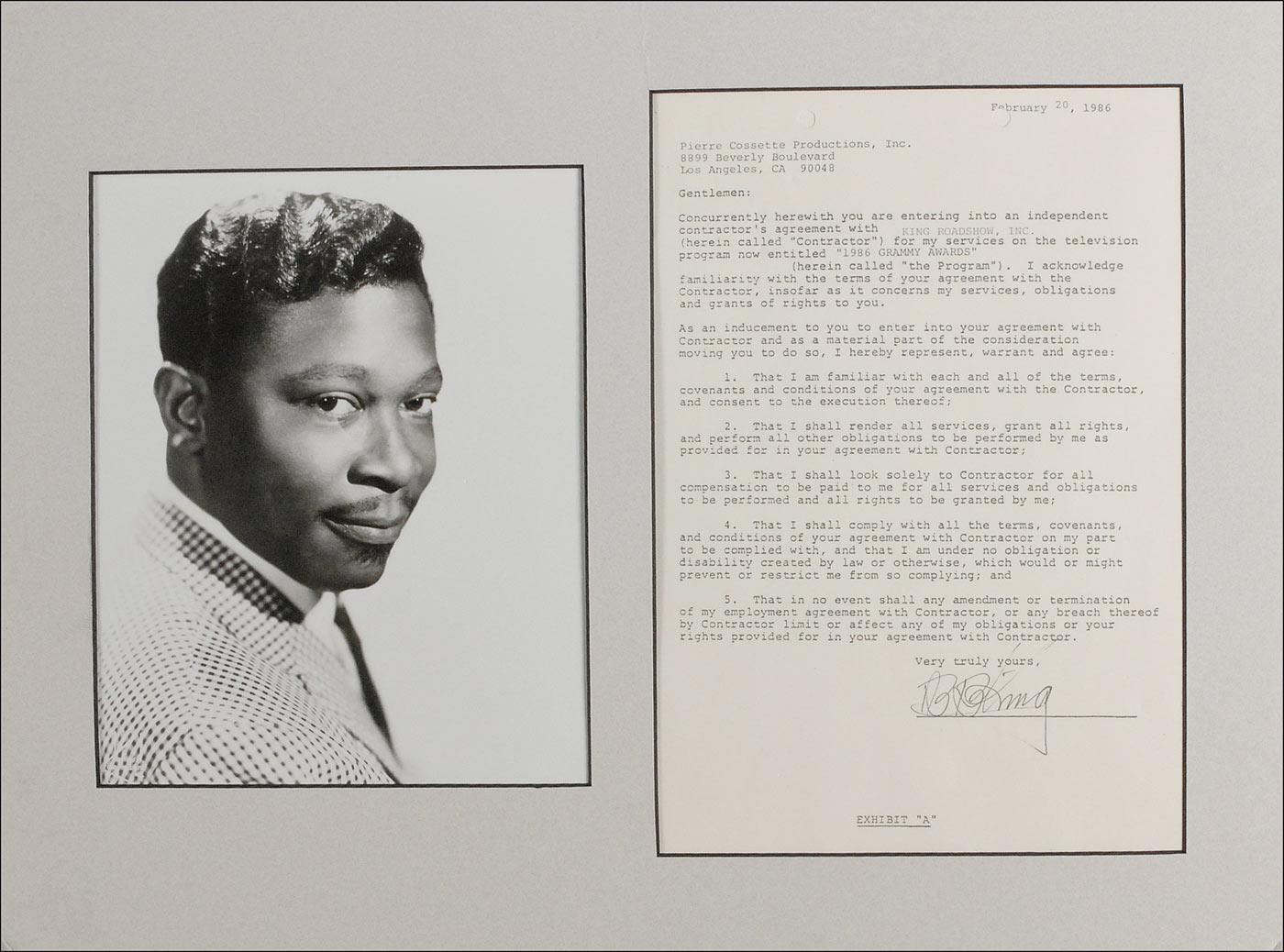 DS, signed “B.B. King,” one page, 7.5 x 11, February 20, 1986. Agreement between the musician and Pierre Cossette Productions. In part: “You are entering into an independent contractor’s agreement with King Roadshow, Inc….for my services on the television program now entitled ‘1986 Grammy Awards’…I am familiar with each and all of the terms, covenants and conditions of your agreement.” In fine condition. Matted with a glossy photo of King in his younger years to an overall size of 18.5 x 13.75.