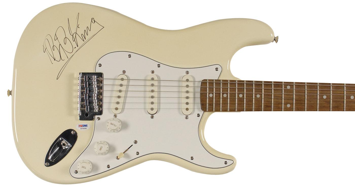 Very nice cream-colored Fender Squier Strat, signed on the body in black felt tip. In fine condition, with a PSA/DNA authentication label affixed to body of guitar and some light soiling to edge of body. Accompanied by a full letter of authenticity from PSA/DNA. Oversized.