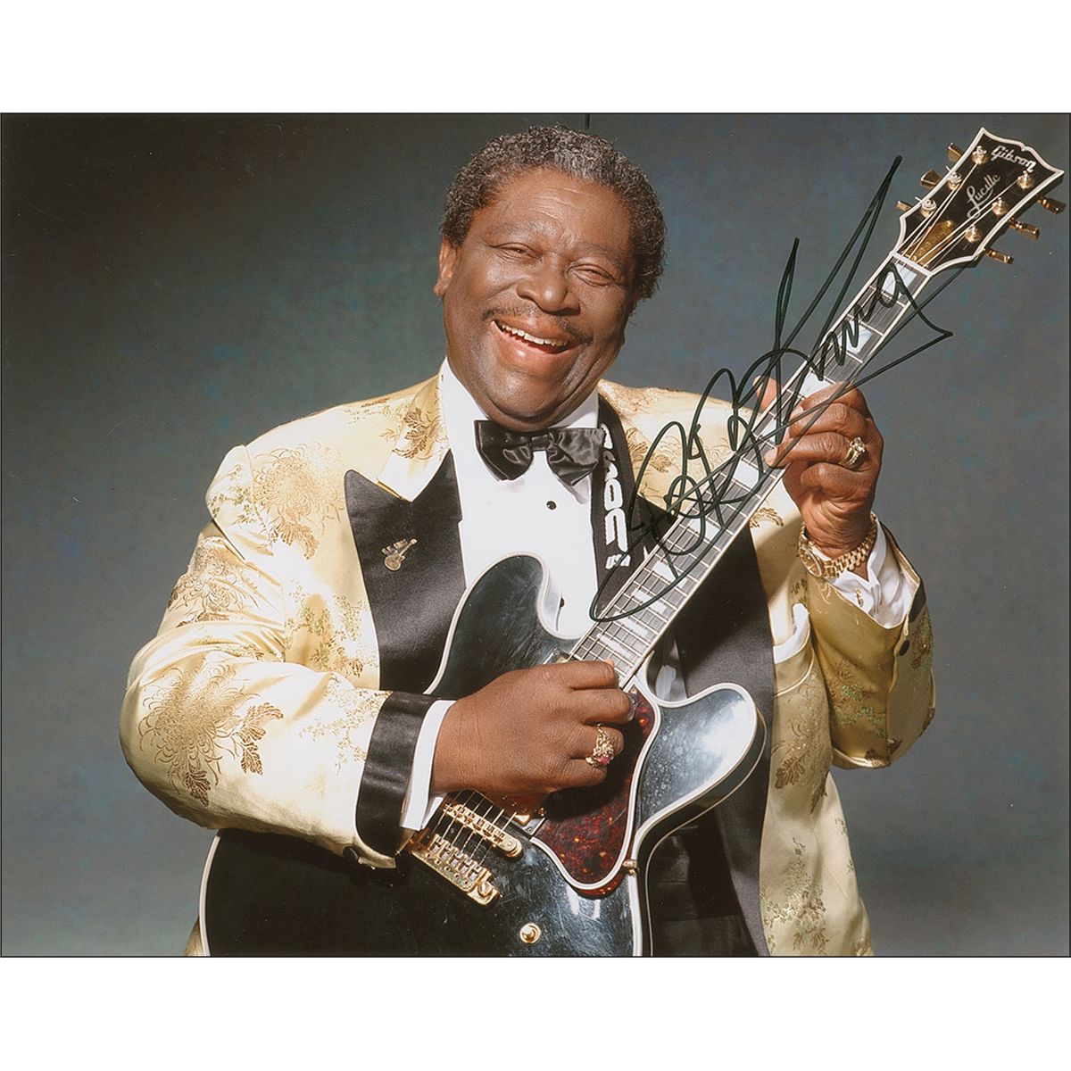 Jovial color glossy 10 x 8 photo of King delightedly holding his guitar, signed in black felt tip. In fine condition, with light contrast to the signature.