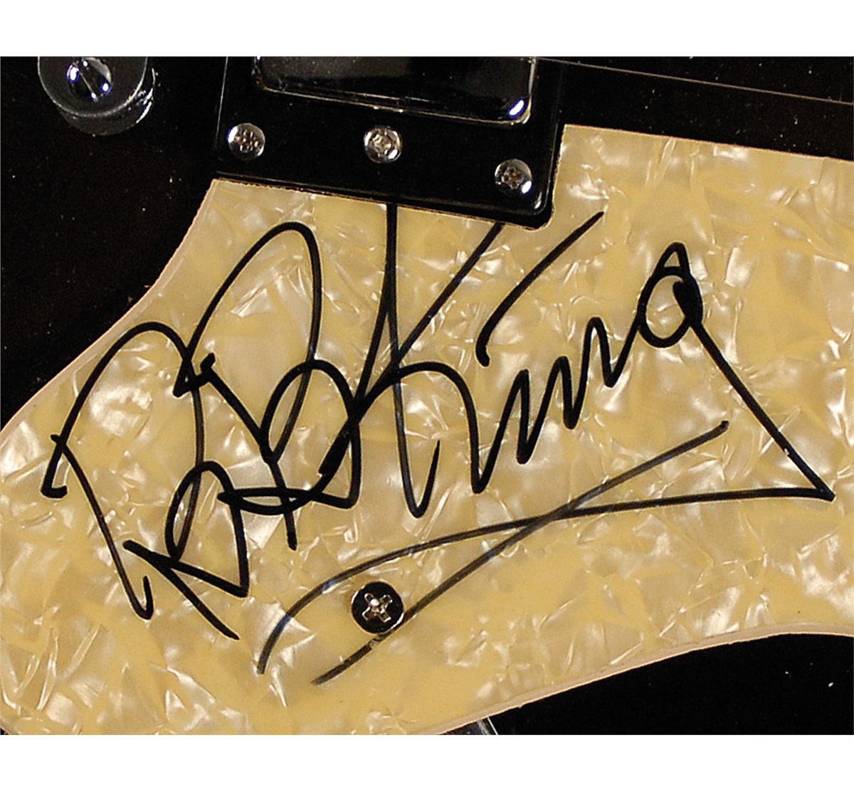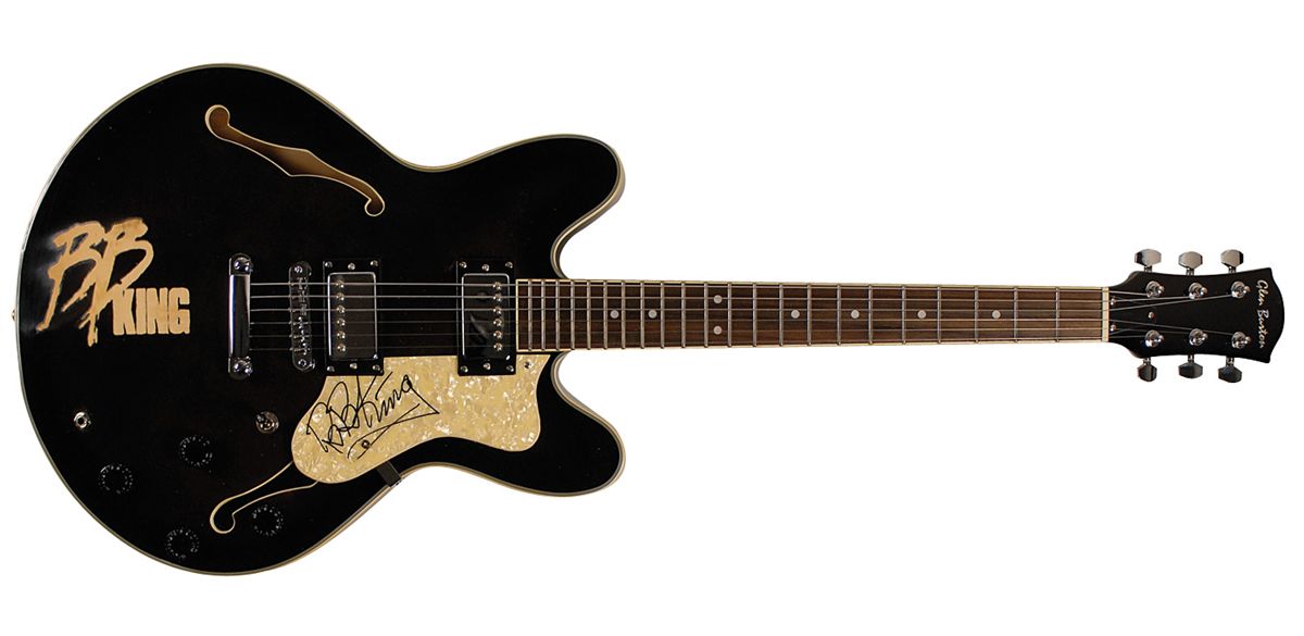 Black-bodied Glen Burton electric guitar, with King’s name applied to the body, signed on the pearloid pickguard in black felt tip. In fine condition. Oversized.