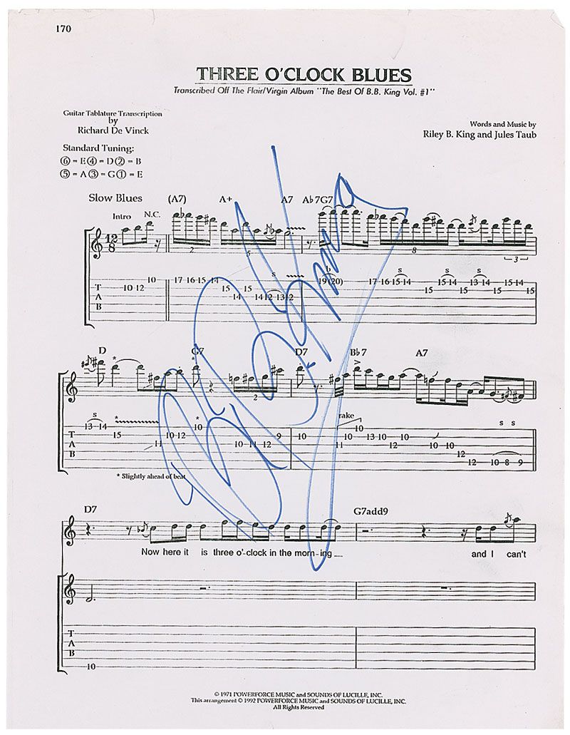 Sheet music to the beginning of ‘Three O’Clock Blues,’ 11 x 15, removed from a larger book, signed in blue felt tip by King. In very good condition, with scattered creases and edge wear and a trimmed edge.