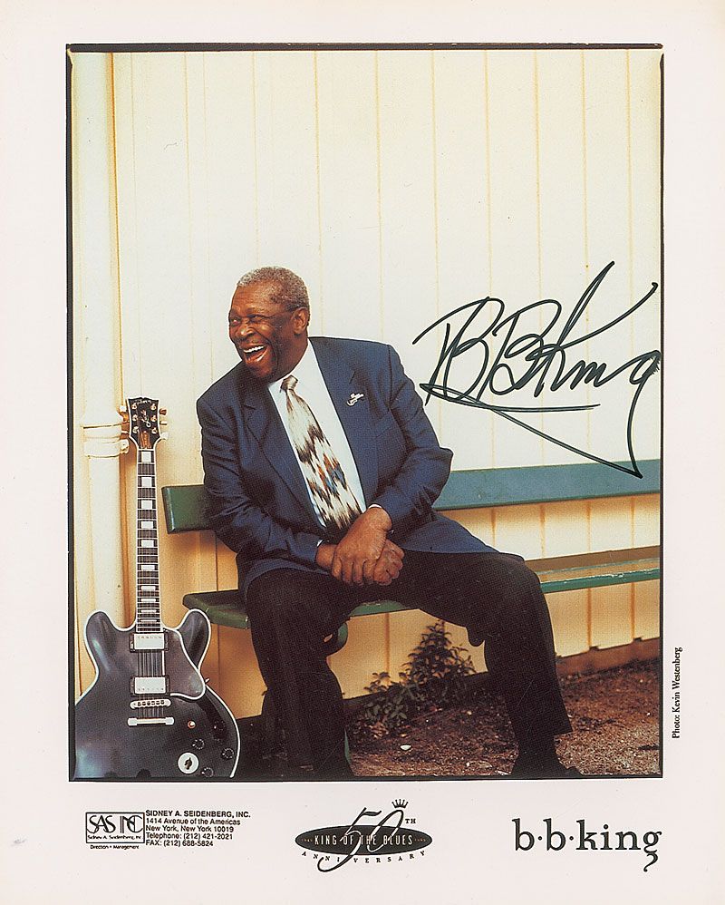 Color 8 x 10 cardstock publicity photo of King sitting on a bench next to ‘Lucille,’ signed in black felt tip. In fine condition. Accompanied by a full letter of authenticity from Roger Epperson/REAL.