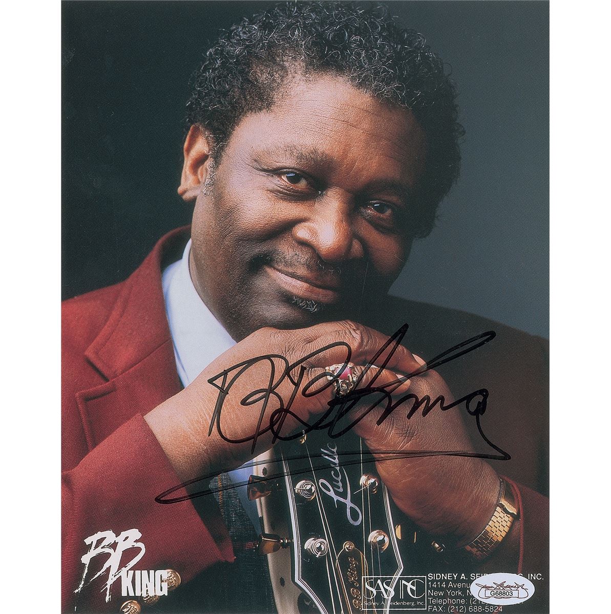 Color 7.5 x 9.5 light cardstock publicity photo of King resting his hands on the head of his Lucille guitar, signed in black felt tip. In fine condition, with a James Spence authentication label affixed to lower right corner. Accompanied by a certificate of authenticity from JSA.