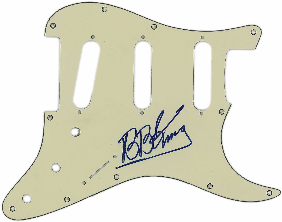 Off-white pickguard for a standard-size Strat, signed in blue felt tip by B. B. King. In fine condition.