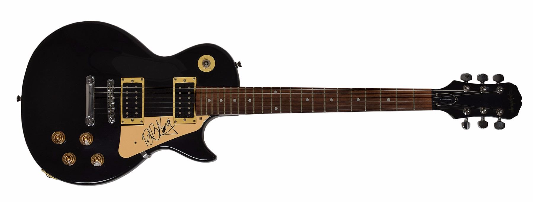 Handsome black-bodied Epiphone Les Paul-style electric guitar, signed on the cream-colored pickguard in black felt tip by B. B. King. In fine condition. Originally obtained by in-person specialist Mike Wehrmann.