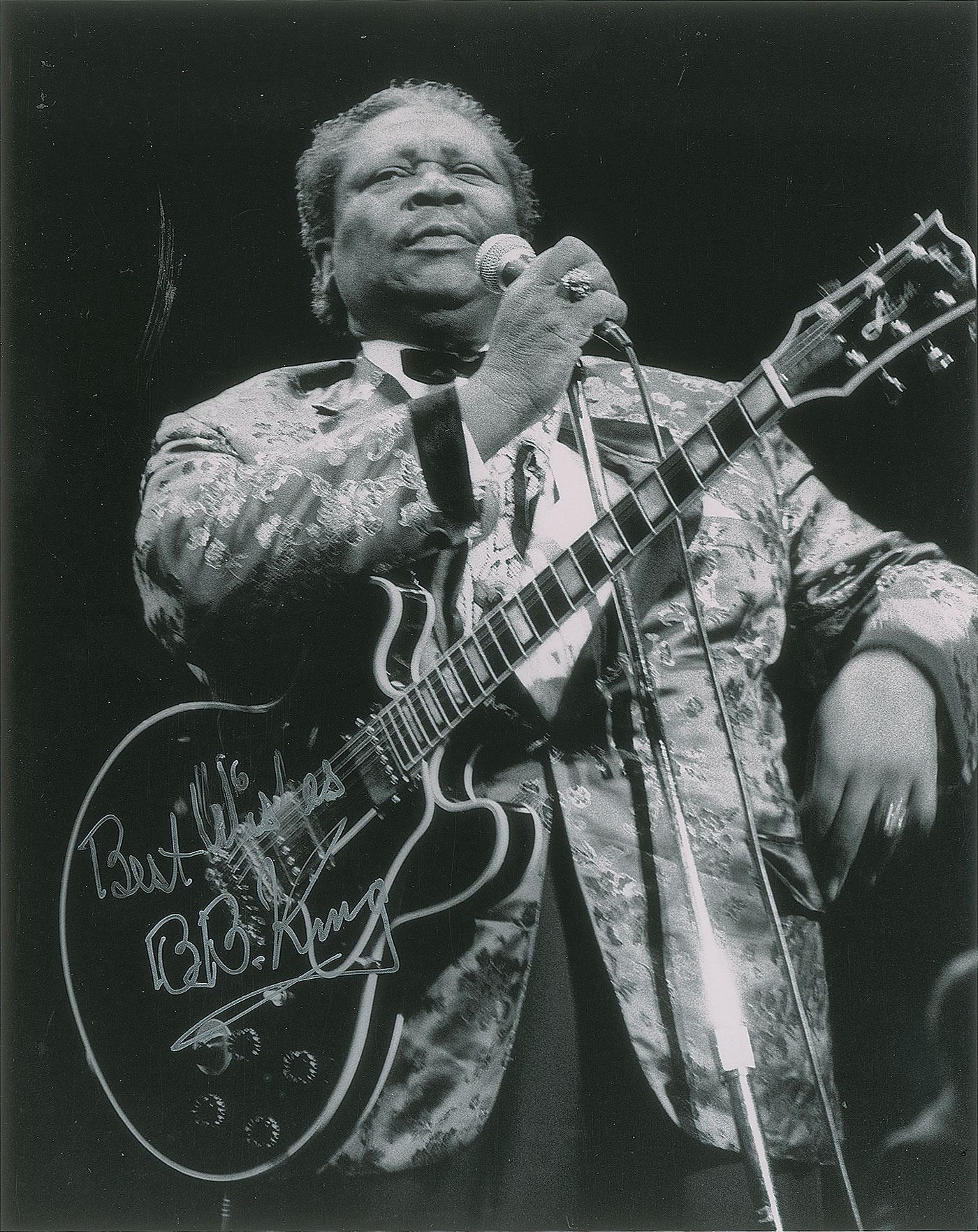 Glossy 8 x 10 half-length photo of King with his guitar and holding a microphone, signed in silver ink, "Best wishes, B. B. King." In fine condition.