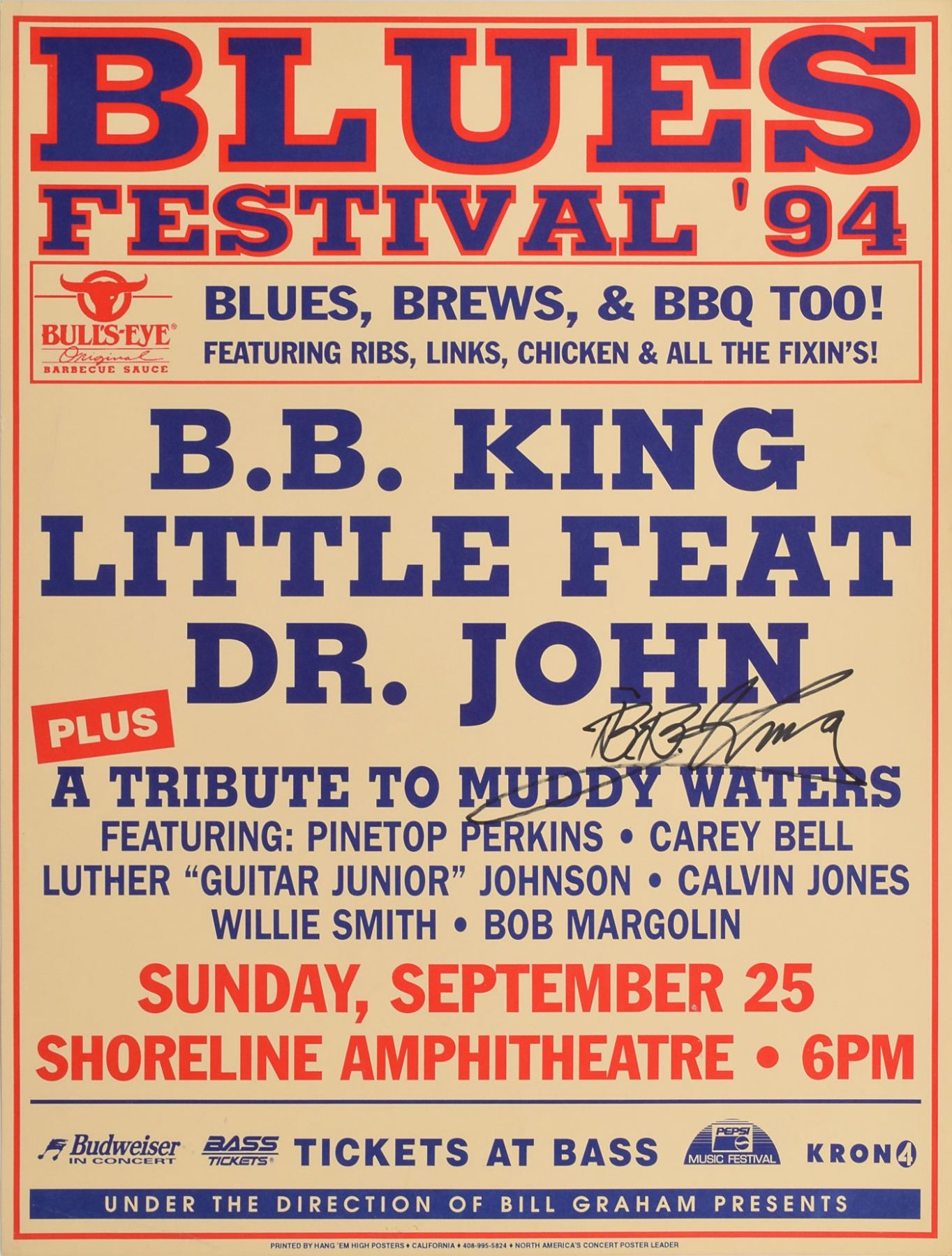 Original color 17 x 22 first printing poster for "Blues Festival '94" at the Shoreline Amphitheatre on September 25, signed in black felt tip by B. B. King. In fine condition.