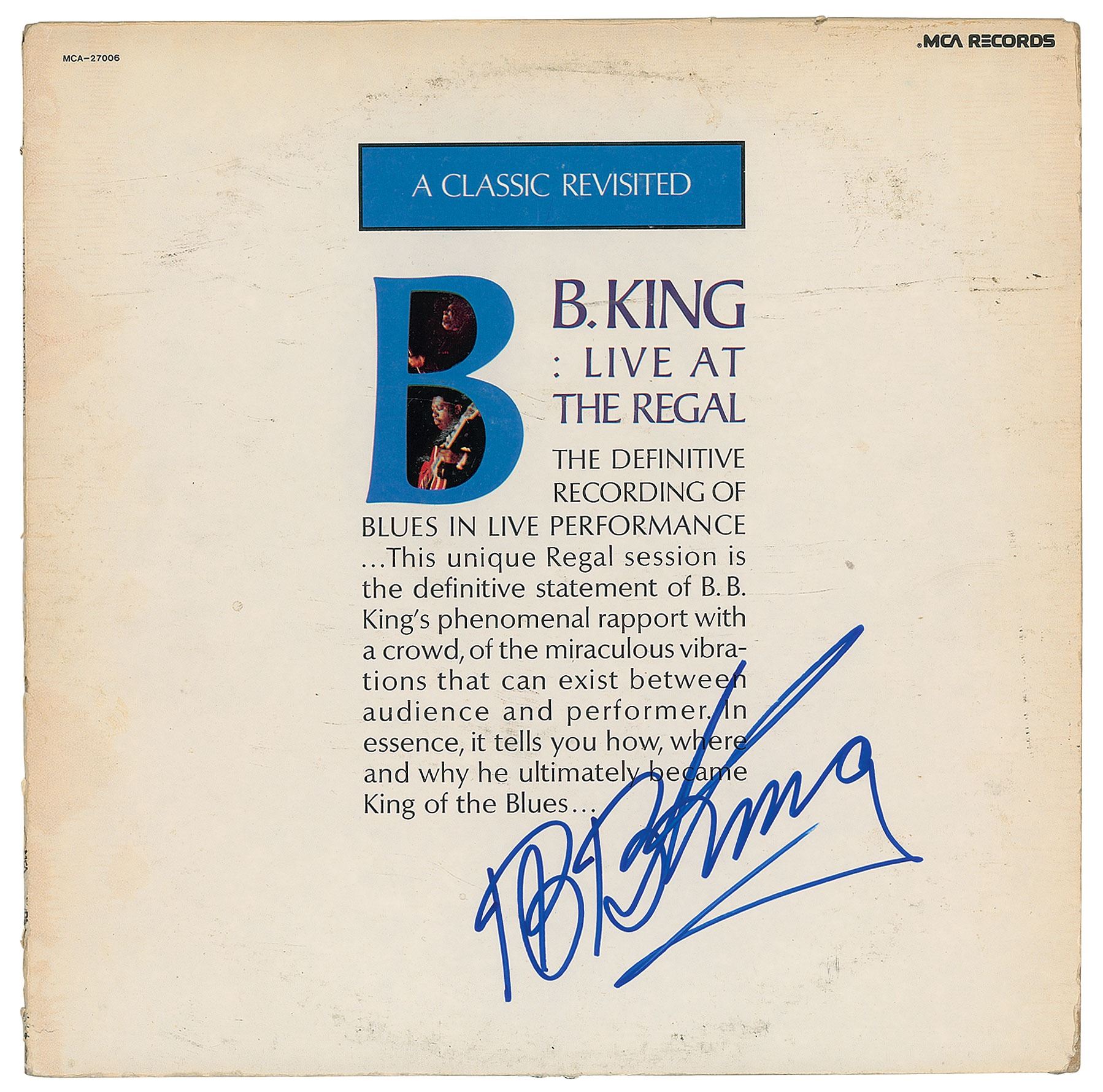 Live at the Regal album by B. B. King, signed on the front cover in blue felt tip. In very good condition, with light scuffing, toning, and some rippling from dampstaining. The record is included.