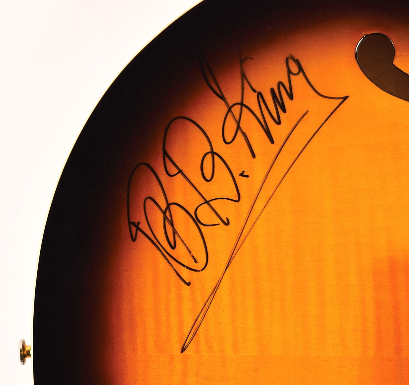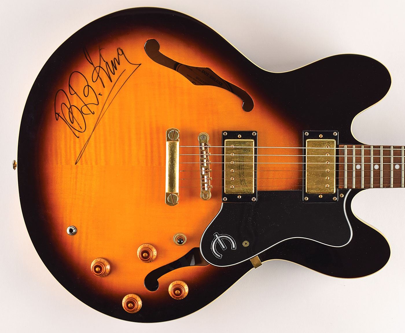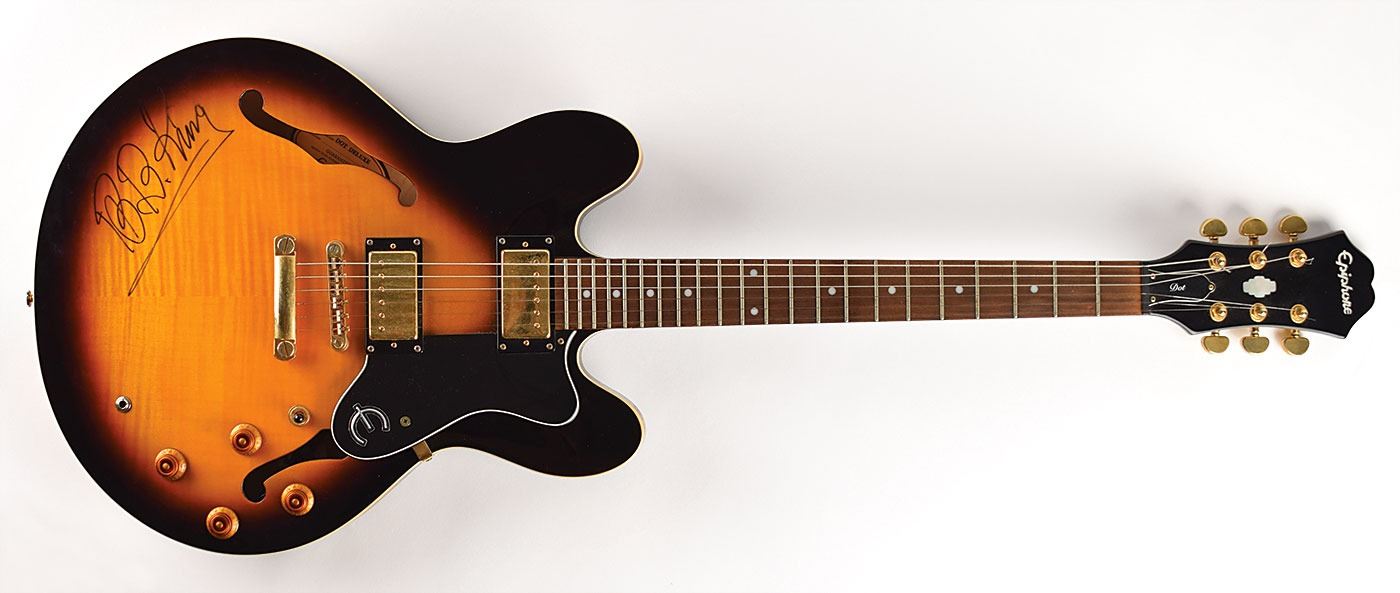 Attractive Epiphone Dot Deluxe semi-hollowbody archtop electric guitar with a sunburst finish, signed prominently on the body in black felt tip by blues legend B. B. King. In fine condition.