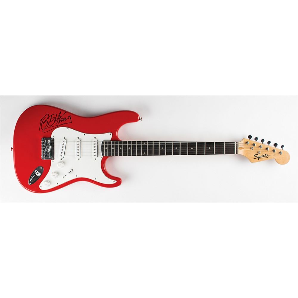 Beautiful red-bodied Fender Squier Bullet Stratocaster electric guitar, prominently signed on the body in black felt tip by blues legend B. B. King. In fine condition.