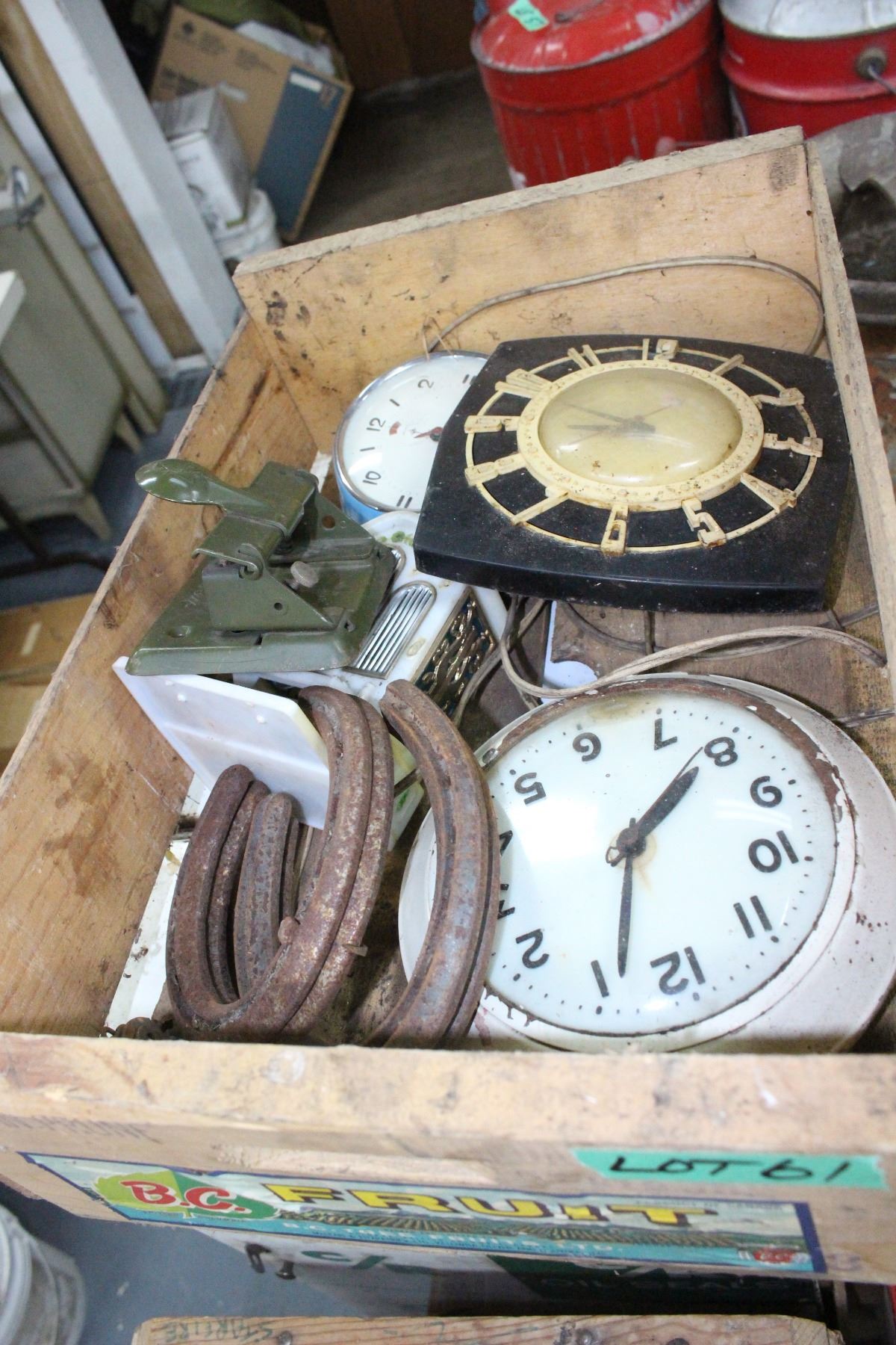 B.C. Fruit Box, 3 Clocks, Paper Punch and Horse Shoes