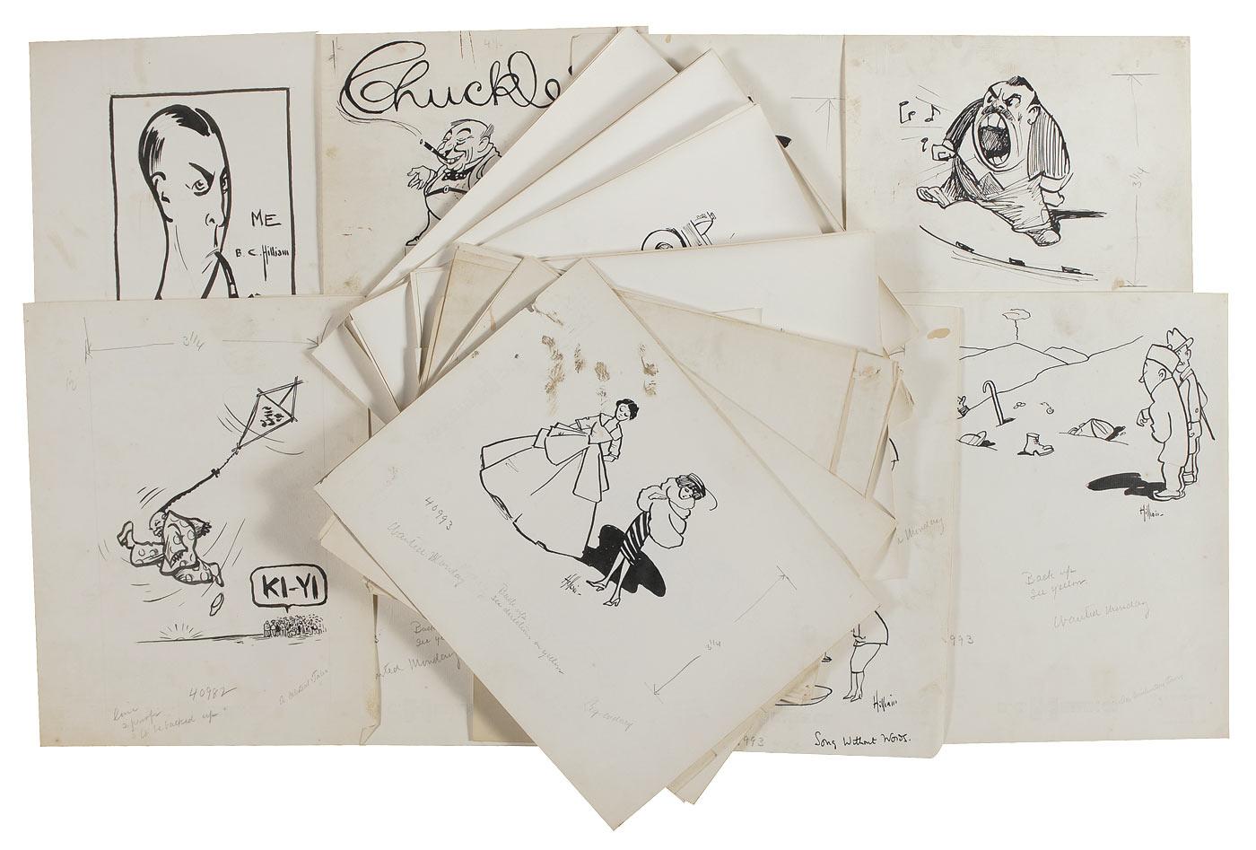 Broadway composer and lyricist. Twenty-nine original vintage ink sketches, some on the reverse of his 8.5 x 11 B. C. Hilliam Co. stationery, with the remaining on various size off-white sheets. Sketches depict various musical, political, and comical situations, each signed by Hilliam. Accompanied by 20 proof sheet pages, most 8.5 x 11, many depicting proofs of the sketches included, with some duplicates. In very good condition, with pencil notations and scattered toning and soiling to sketches, as well as some light edge wear. Provenance: The Barry Hoffman Collection.