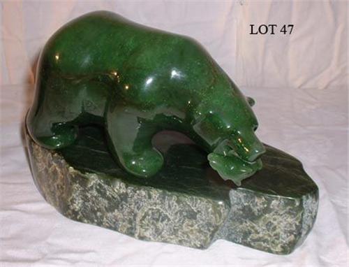 ARTIST: JASON HO, # JW1252, BEAR - 8 ½" L, 3 3/4" H, 3" W, BASE - 10" L, 41/2" H, (TAIL ON FISH IN BEAR'S MOUTH IS BROKEN), WEIGHING 13.5 LBS.