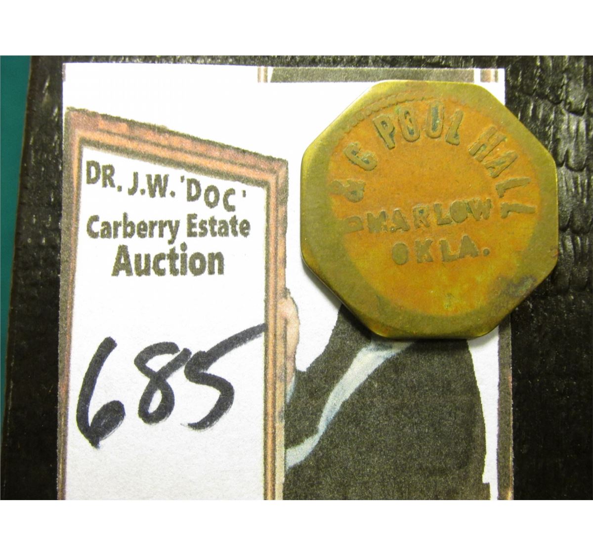 "B & C Pool Hall/Marlow, Okla.", rev. "Good For/10c/In Trade", oct., br., 20mm. 'Doc' valued at $18. Less than 5,000 people in the entire town.
