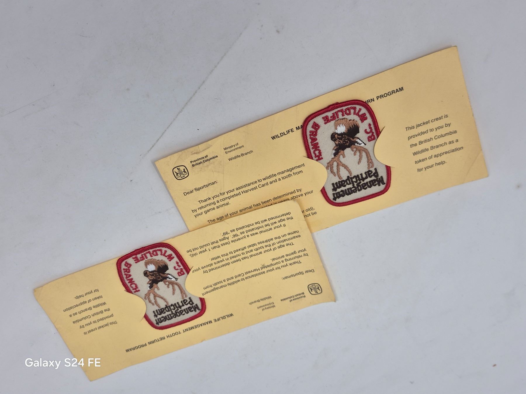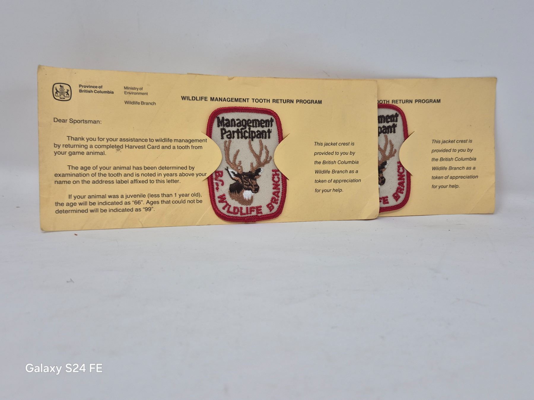 Two embroidered "Management Participant – B.C. Wildlife Branch" jacket patches, still attached to info cards from the Wildlife Management Tooth Return Program.
