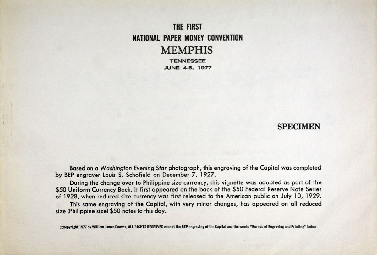 B.E.P. Card from 1st Memphis Paper Money Show. Memphis Tennessee. June 4-5, 1977. Autographed Signatures of Dealers and Attendees. #00109 with several signatures of famous paper money dealers and collectors who are no longer with us. Signed by the following: Don Kagin, Harry Fourman, William P. Donlon, Eva Jubangik, Mike Crabb, Chuck O'Donnell, Rob Kravitz, William Doovas, Dusty Royer, Ossie Sr., John Rowe III, John Hickman, Amon Carter, Don Kelly, Harry Jones, Don Fisher, Howard Chone, Mike Marchine.