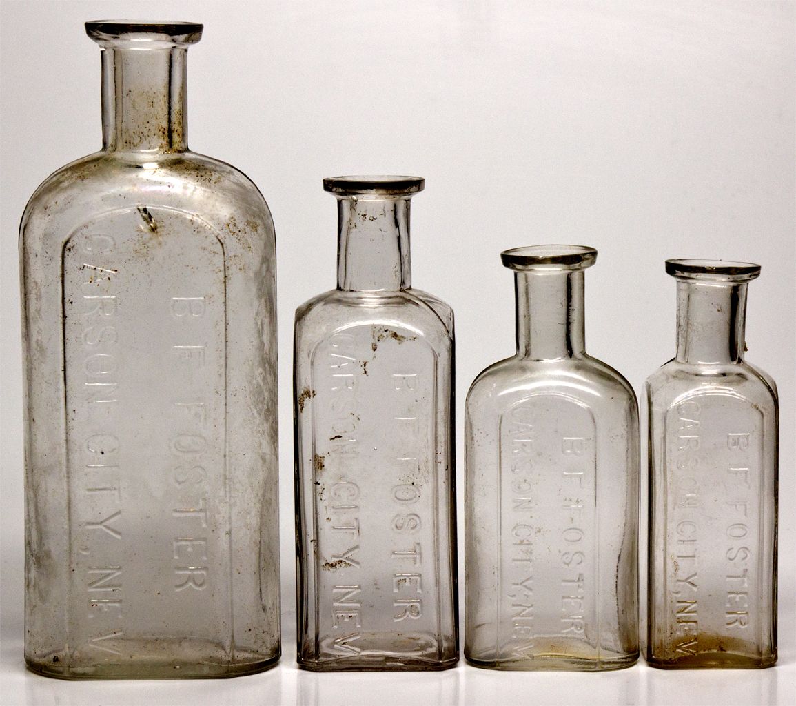 Lot of 4 drug bottles from this Carson City druggist. 1) This is an oval 7" sample in clear glass. No visible damage. 2) A shorter 4.5" version of the previously listed oval, with a small chip on the lip. 3) Square style clear 5.5" with a very small rough spot on the lip. 4) Small 4" square, clear. All bottles are embossed B.F. FOSTER CARSON CITY, NEV. Benjamin Franklin Foster opened his first drug store 1874 at 131 Carson Street. In 1878, he moved to 13 So. Carson Street. He remained there until 1881, when he sold the business to Virginia City druggist A. Lernhart and retired to San Bernardino [Ref: Nevada History Through Glass Vol. II, Fred Holabird, 2012]. - Jacobitz Collection -59564