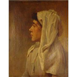 B Fitz / 93- Framed oil on canvas portrait continental girl with head scarf, 48cms x 40cms