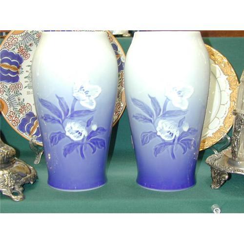 This is a gorgeous pair of Bing and Grondahl porcelain vases. They are blue and white and the flowers are in fact patterened. They are sl;ightly raised from the body of the vase.