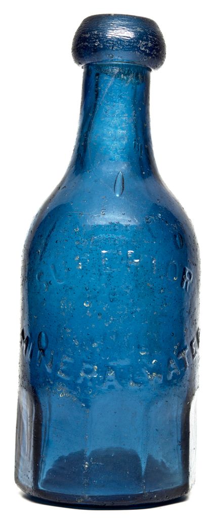 Beautiful blue blob top bottle, for Superior Mineral Water. Measures about 7” tall. Some wear including air bubbles and some little dings. No chips. This bottle was most likely made in the eastern U.S., then shipped by a steamer to San Francisco. -59729