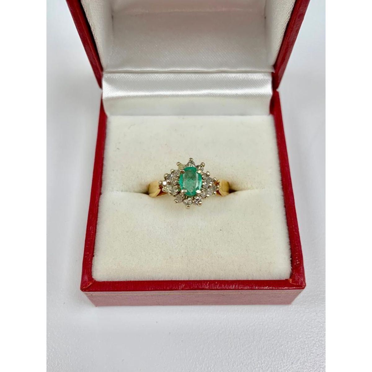 This amazing ring consists of a oval cut Emerald main stone, and is surrounded by twelve round cut diamonds, each precisely placed to bring out the Emeralds wondrous color. Please view photos for further details. Gemstone type: Emerald Weight: 0.21ct Color: - Light green Clarity: I1, Included Cut: Excellent Shape: Round Â