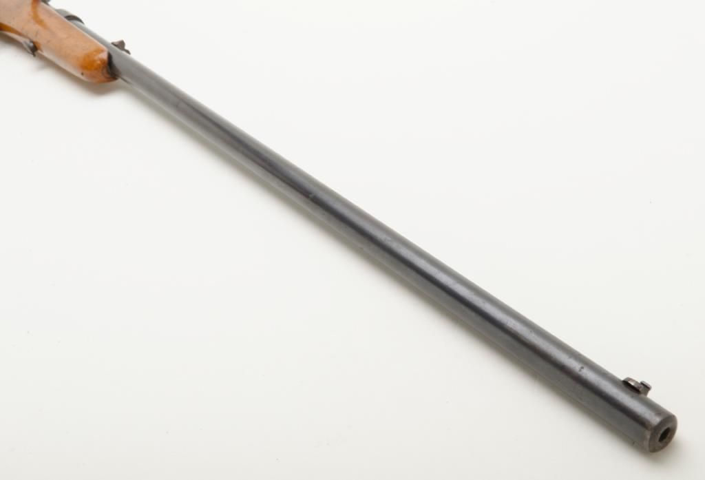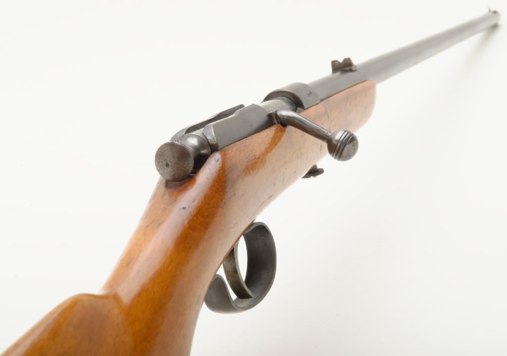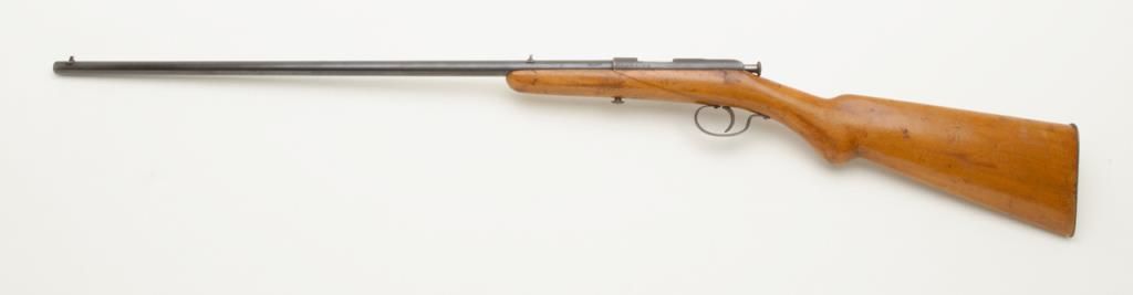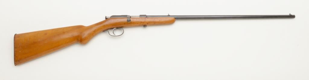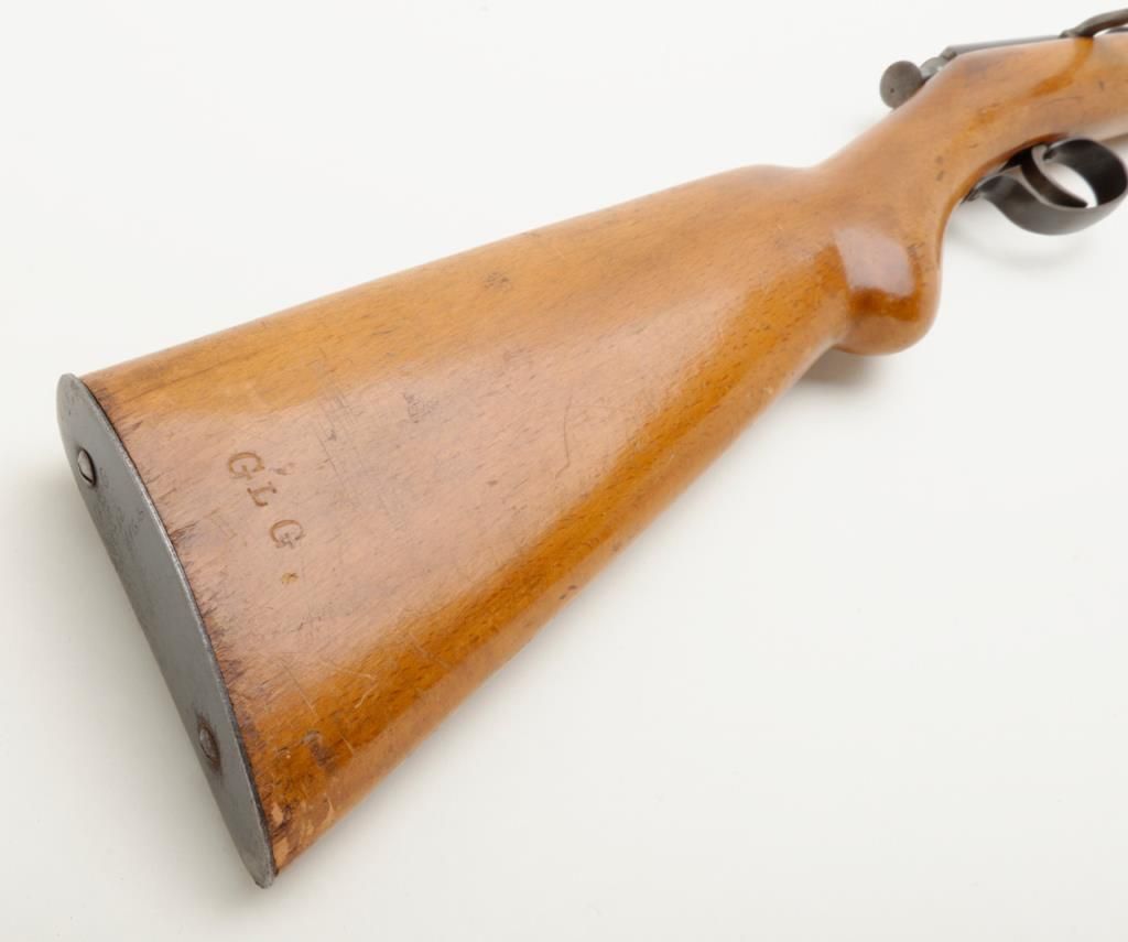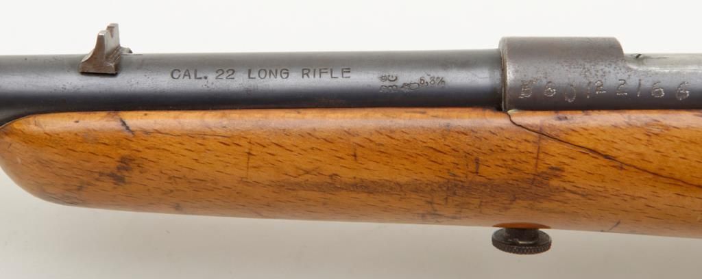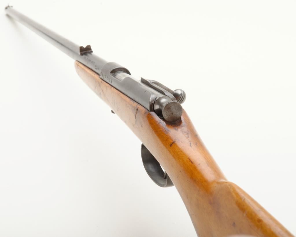 B.H. Dyas Co. of Los Angeles single shot rifle, cal..22 LR, serial #NSNV. The rifle is in overall fair to good condition with a 24” blued barrel and action. The rifle retains the majority of its blued finish, with a good bore and smooth wood stock. The stock has some shrinkage around a smooth metal butt plate and the previous owners initials and driver’s license number have been added to the receiver and butt plate. Est.: $50-$100 (Modern/PPT)