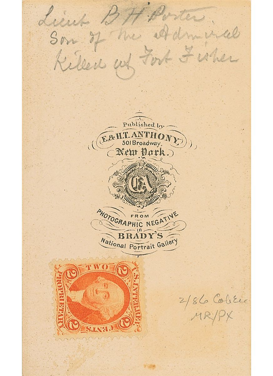 Union officer, son of Admiral D. D. Porter, who was killed in action at Fort Fisher. Unsigned original 2.25 x 4 carte-de-visite photo by Anthony of New York, with a pencil identification in the lower border and on reverse. In fine condition, with a revenue stamp affixed to reverse.