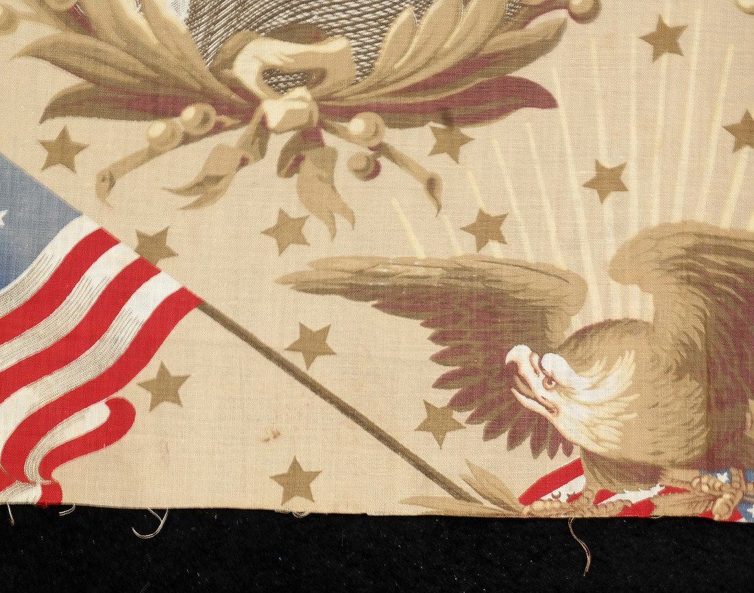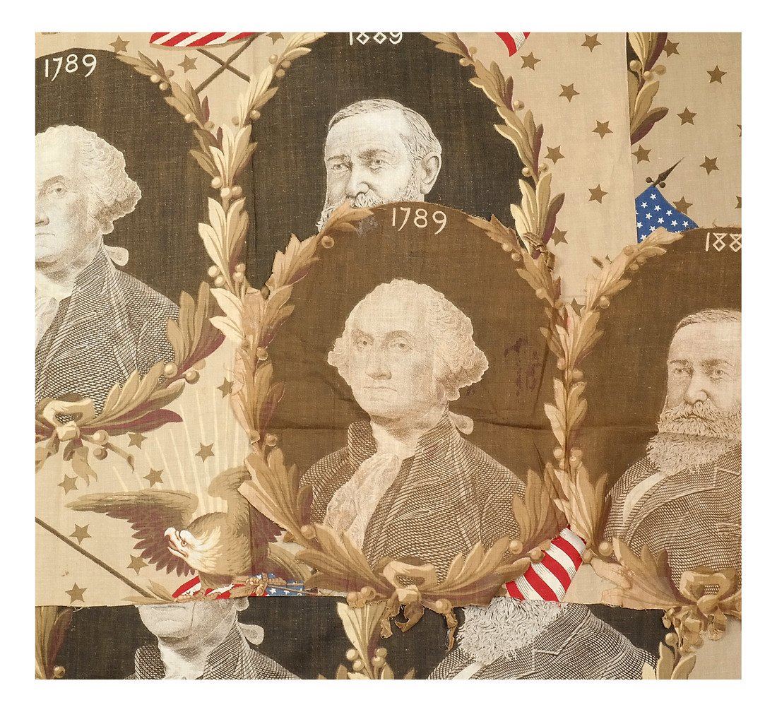 Three printed cotton fragments with vertical repeat, featuring jugate portraits of George Washington and 1888 Republican presidential candidate Benjamin Harrison. Bears dates 1789 and 1889 to commemorate the centennial of George Washington's inauguration. Oval portraits bear olive branch surround, as well as eagle, shield, and both 13-star and 42-star flag elements.