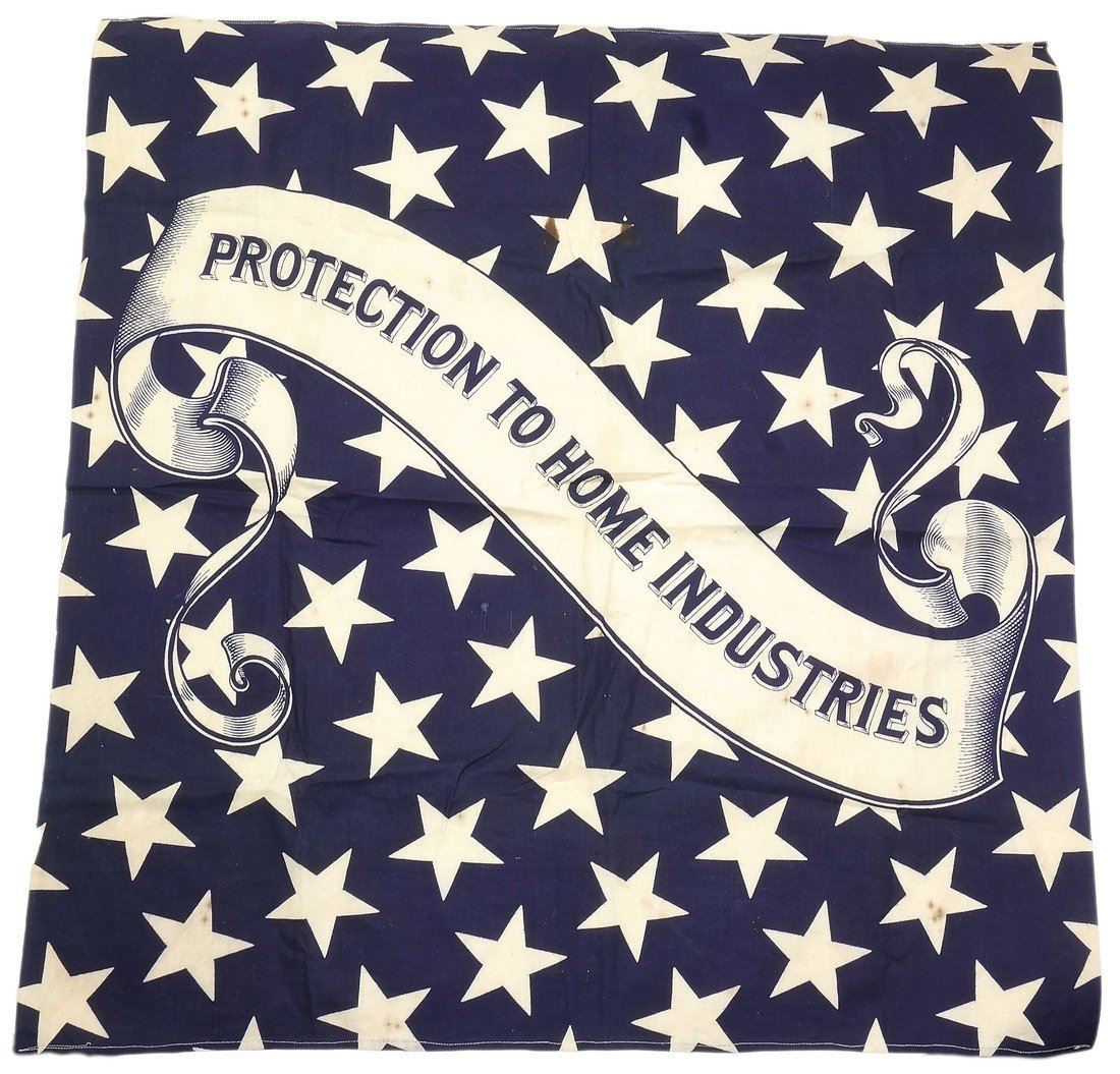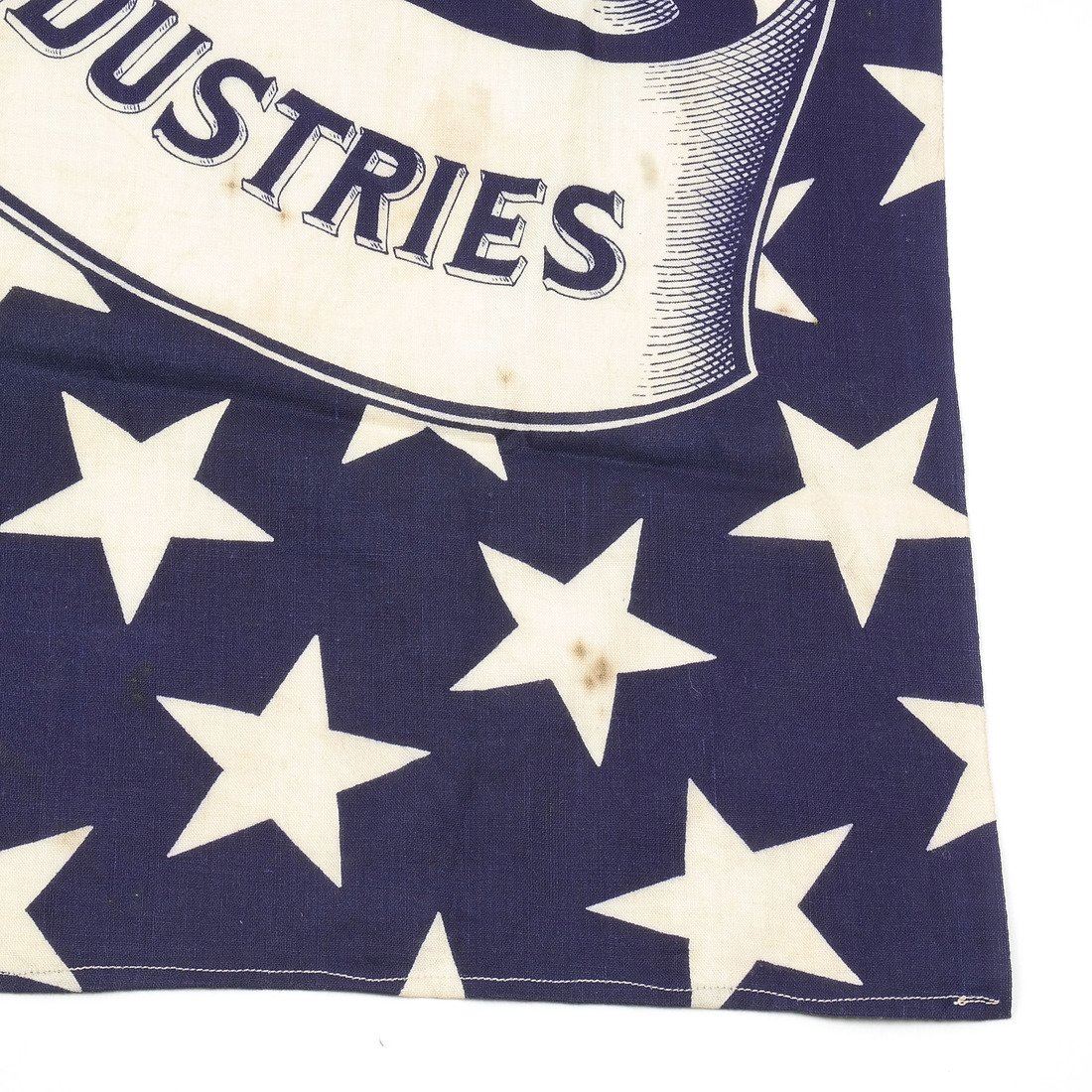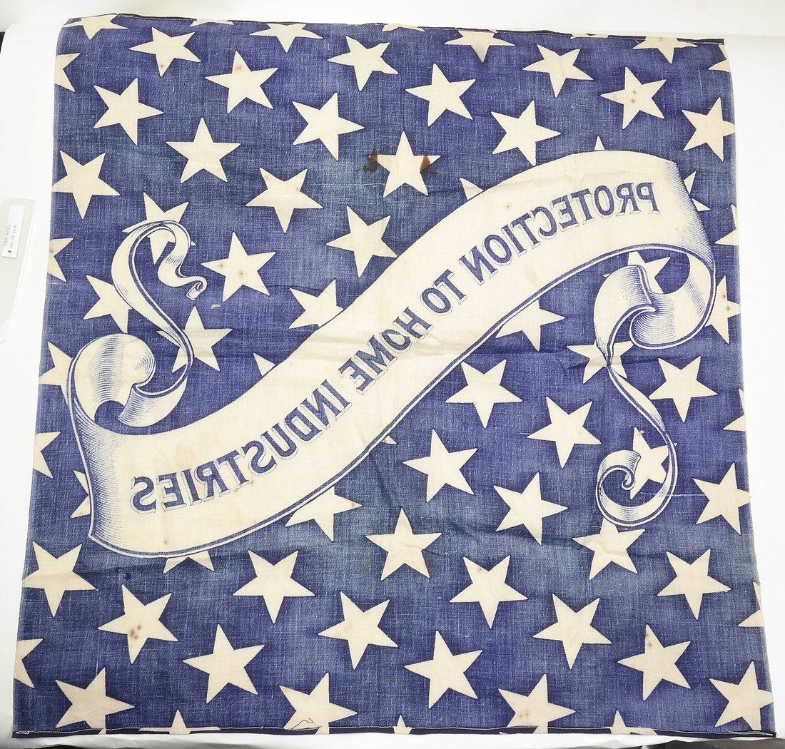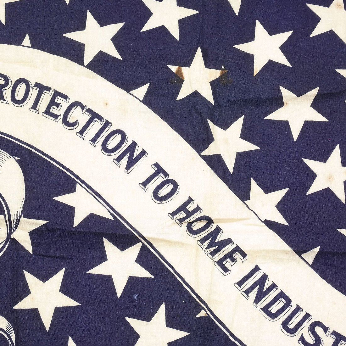 Deep blue cotton bandana or full-repeat of bunting announcing the platform of the 1888 Republican presidential candidate Benjamin Harrison. Decorated with repeating stars and banner with text "Protection to Home Industries".